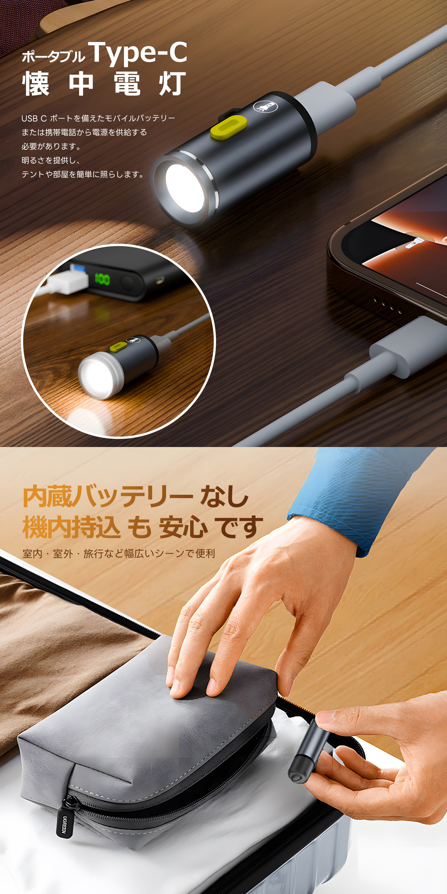 USB-Cポートに差し込むと、即席でナイトライトとして使用可能。寝室やテント内、停電時の非常灯としても役立ちます。■コンパクト設計で持ち運びラクラク