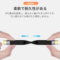 FPC素材を採用し、柔らかく曲げやすいケーブルです。引っ張られても伸びたり変形しない丈夫な作りになっています。絡まることが無いので持ち運びやすいです。