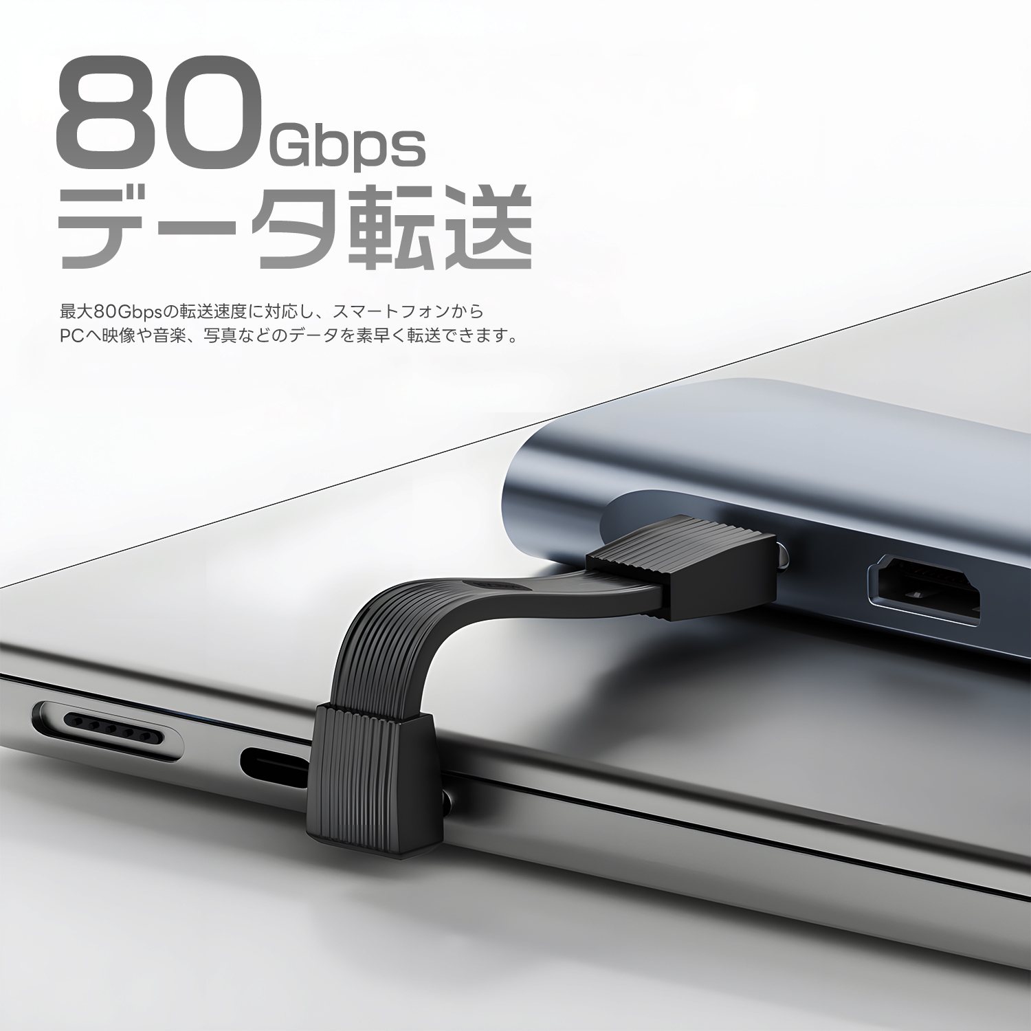 最大80Gbpsの超高速データ転送に対応しており、大容量の動画や画像ファイルもストレスなく移動可能です。高帯域幅により、遅延や映像の途切れを防ぎ、快適な作業環境を提供します。8K映像や大型ファイルの取り扱いもスムーズです。