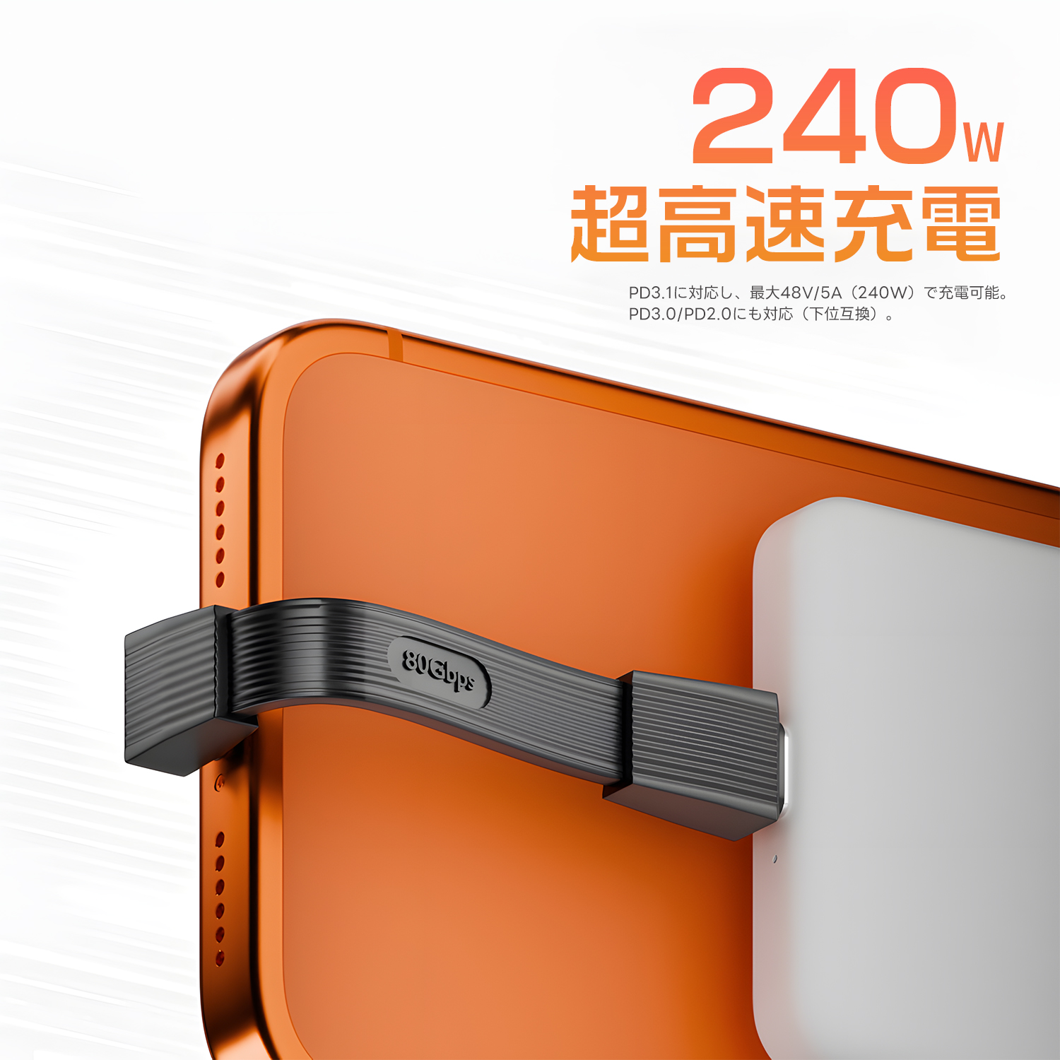 最大240Wの高出力に対応しており、スマートフォンやノートPC、タブレットなどを急速充電できます。長時間の作業や出張時でも、ケーブル一本で効率的に電力供給が可能です。