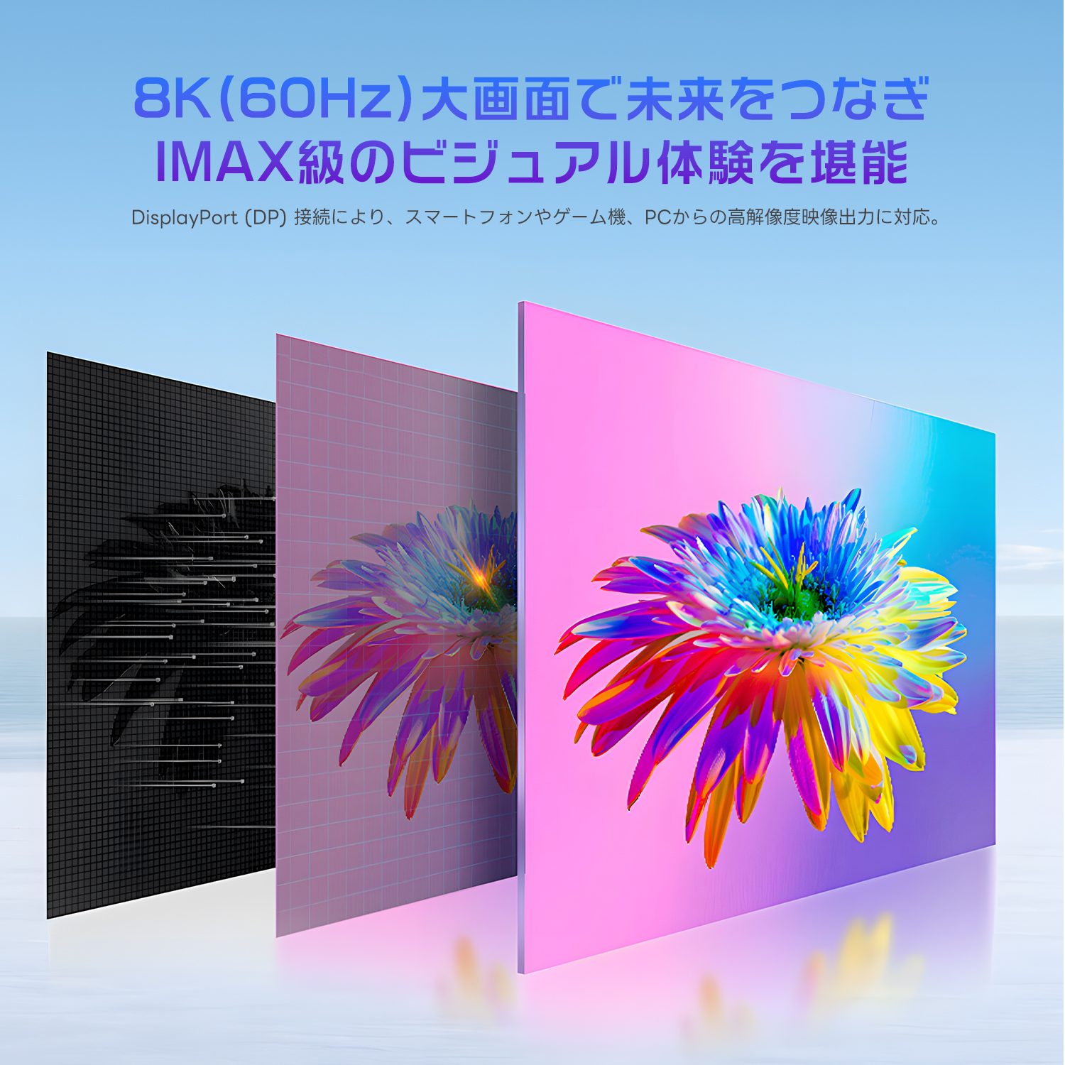 8K(60Hz)の大画面映像に対応し、IMAX級の迫力ある映像体験を楽しめます。DP接続により、スマホ、ゲーム機、PCからの高解像度映像出力が可能です。さらに、用途に応じて4種類のケーブル長を選択でき、設置場所やデバイスに合わせて最適な長さを選べます。