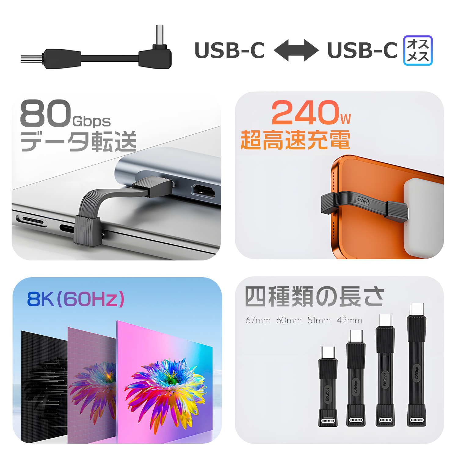 家庭、オフィス、外出先など、さまざまなシーンで活躍します。仕事用のPC接続から、スマホの高速データ転送、ゲーム機やディスプレイとの映像出力まで、幅広い用途に対応し、1本で複数のニーズを満たします。