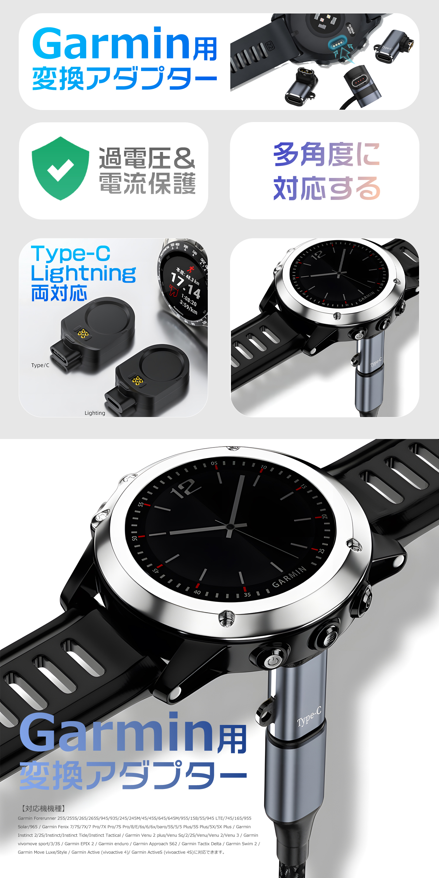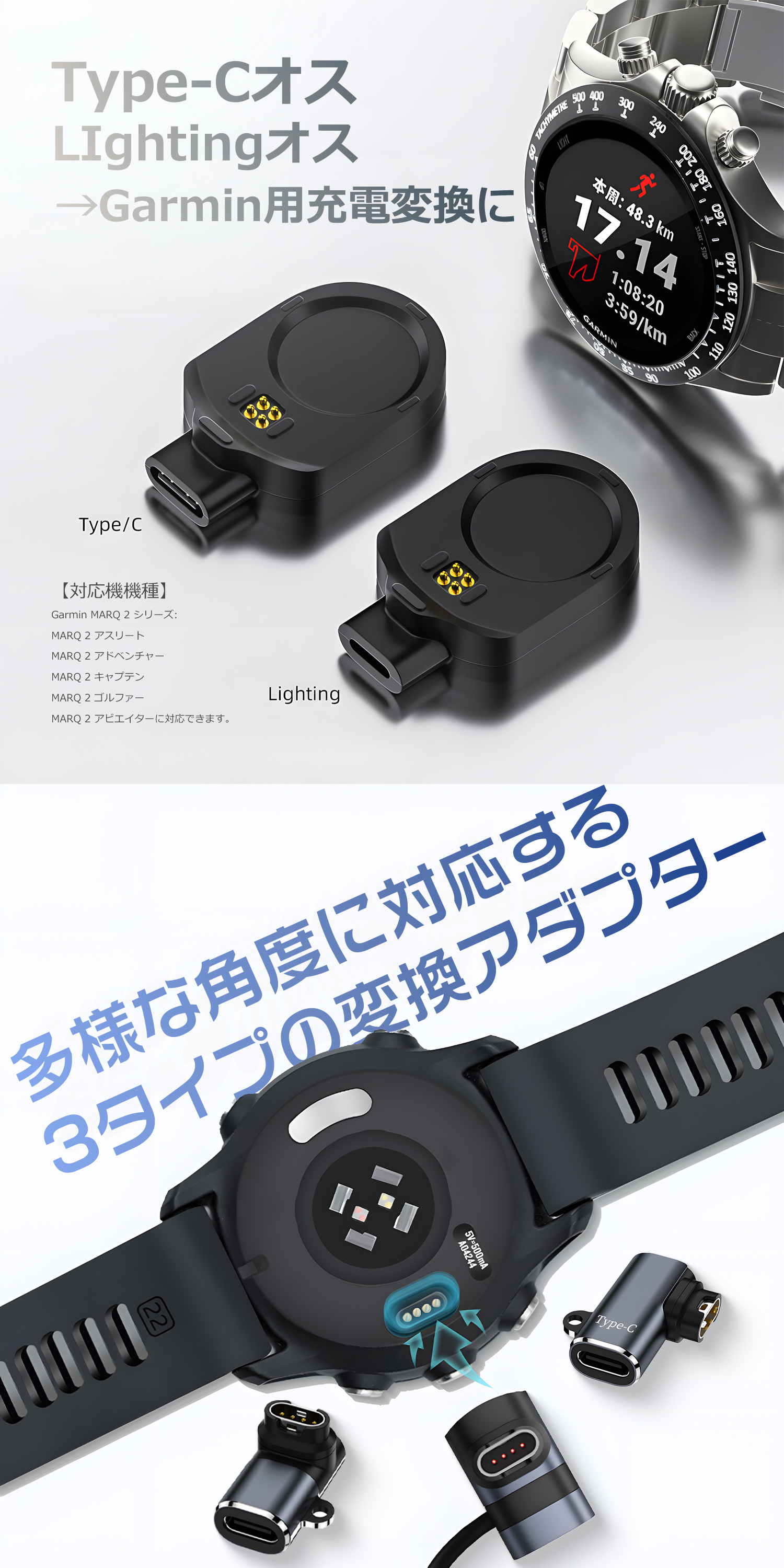 Garmin MARQ 2シリーズ【Type-Cオス&Lightingオス】:MARQ 2 アスリート/MARQ 2 アドベンチャー/MARQ 2 キャプテン/MARQ 2 ゴルファー/MARQ 2 アビエイターに対応できます。Garmin Forerunner 255/255S/265/265S/945/935/245/245M/45/45S/645/645M/955/158/55/945 LTE/745/165/955 Solar/965 / Garmin Fenix 7/7S/7X/7 Pro/7X Pro/7S Pro/8/E/6s/6/6x/baro/5S/5/5 Plus/5S Plus/5X/5X Plus / Garmin Instinct 2/2S/Instinct/Instinct Tide/Instinct Tactical / Garmin Venu 2 plus/Venu Sq/2/2S/Venu/Venu 2/Venu 3 / Garmin vivomove sport/3/3S / Garmin EPIX 2 / Garmin enduro / Garmin Approach S62 / Garmin Tactix Delta / Garmin Swim 2 / Garmin Move Luxe/Style / Garmin Active (vivoactive 4)/ Garmin ActiveS (vivoactive 4S)に対応できます。ウォッチ用充電器です。※スマートウォッチ本体は含まれておりません。