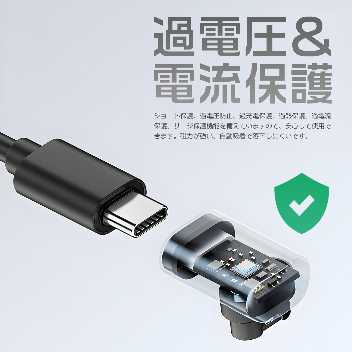 Type-CオスとLightningオスを接続するだけで、スピーディーに充電可能。ショート保護や過電圧・過電流・過熱を防ぐ多重保護システムを搭載し、サージ保護機能も備えています。強力な磁力で自動吸着し、しっかり固定されて落下しにくい設計です。
