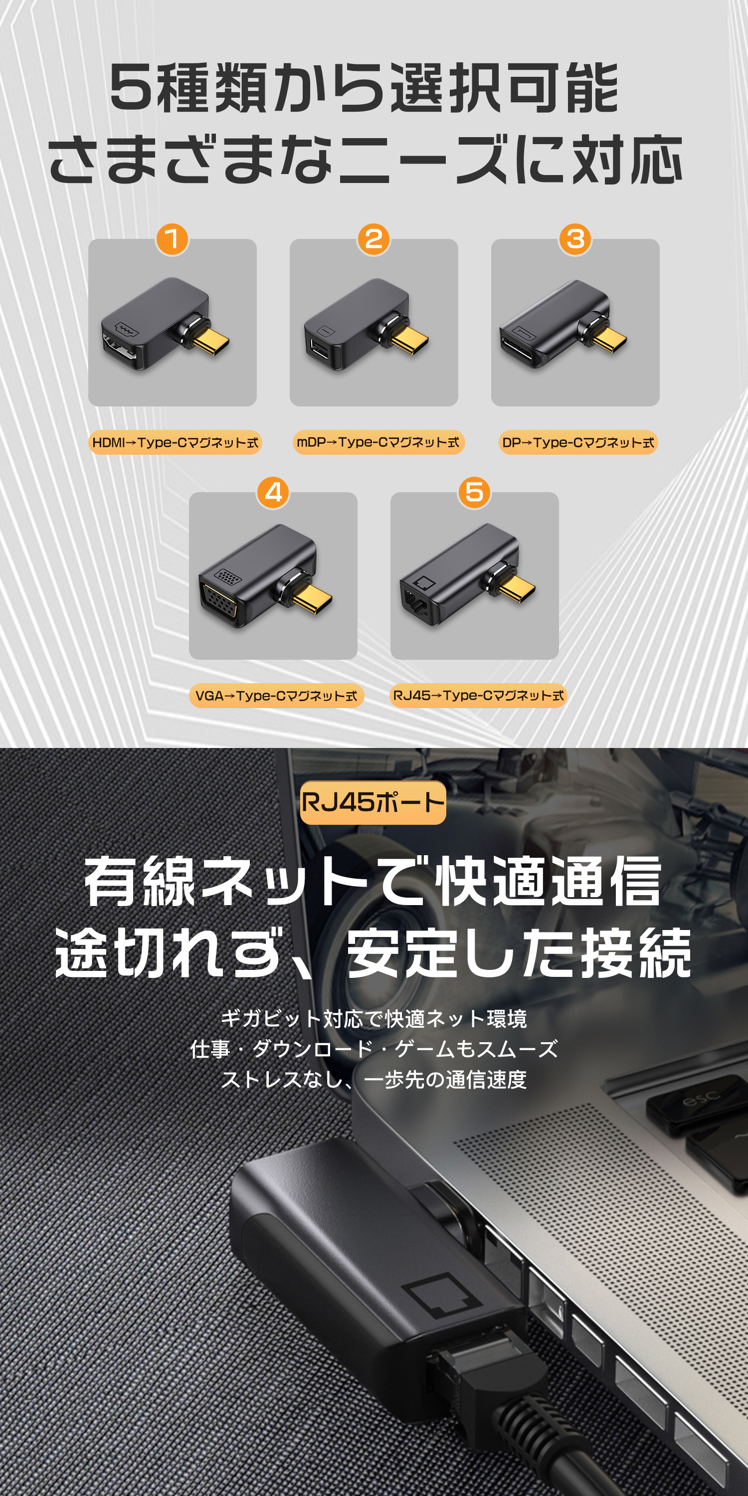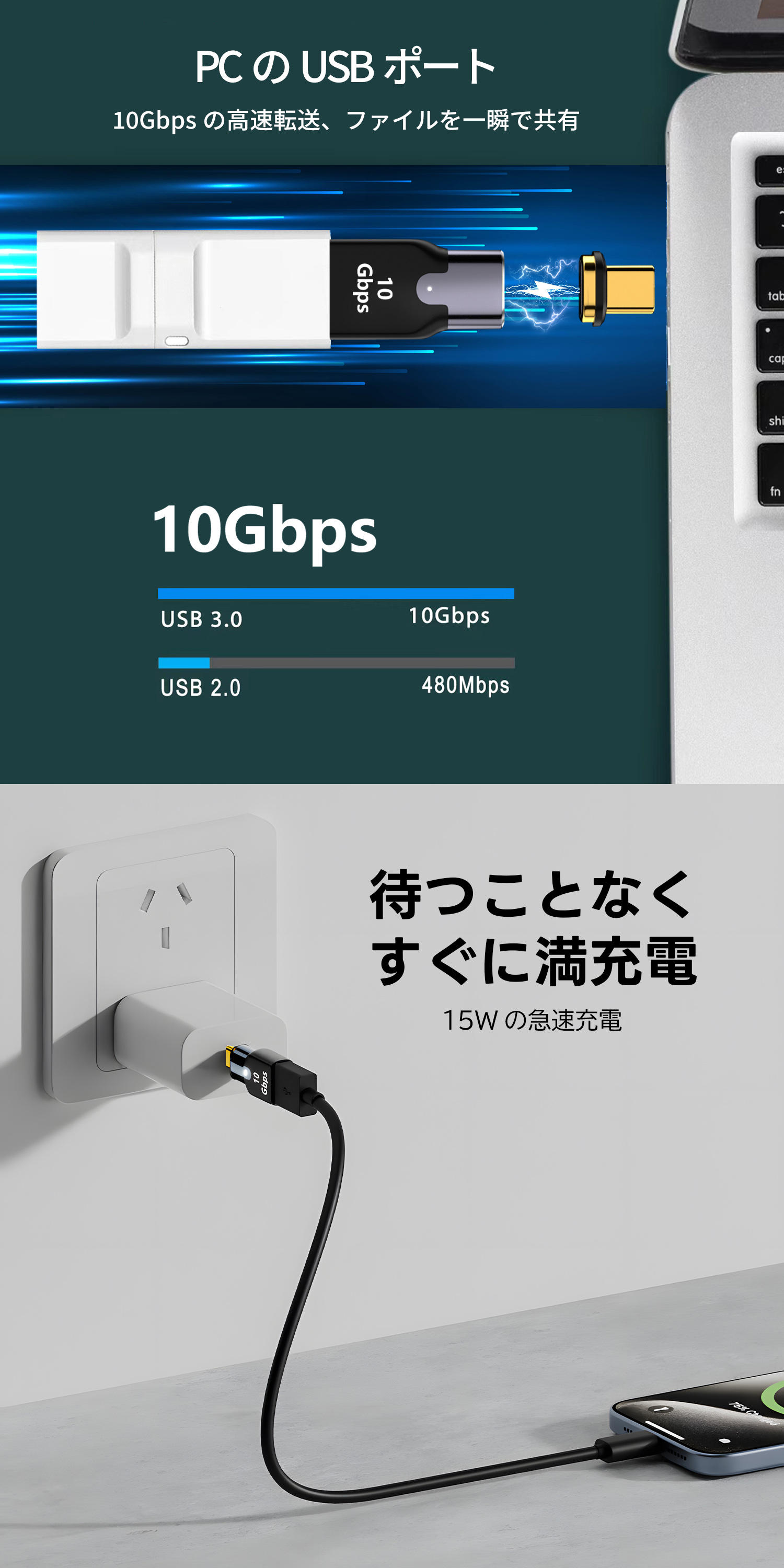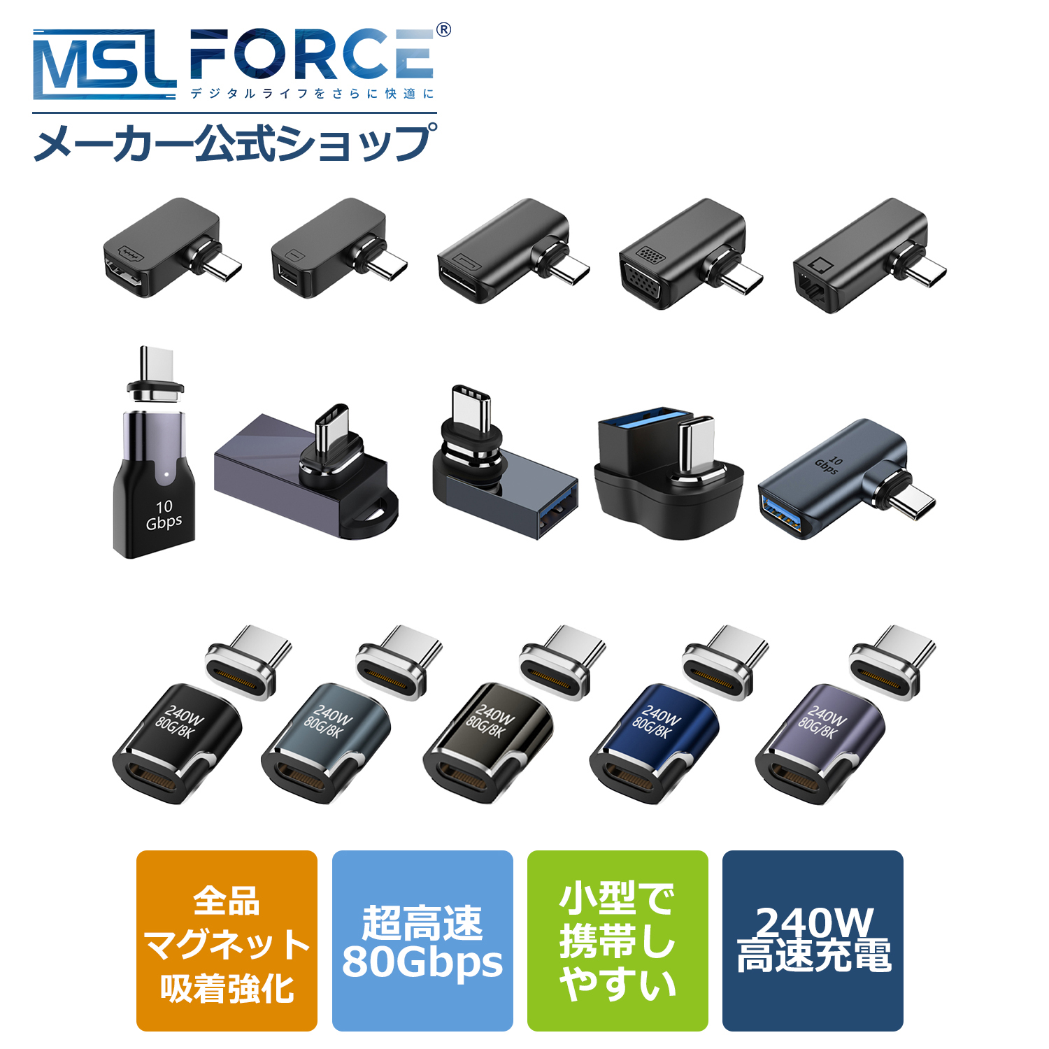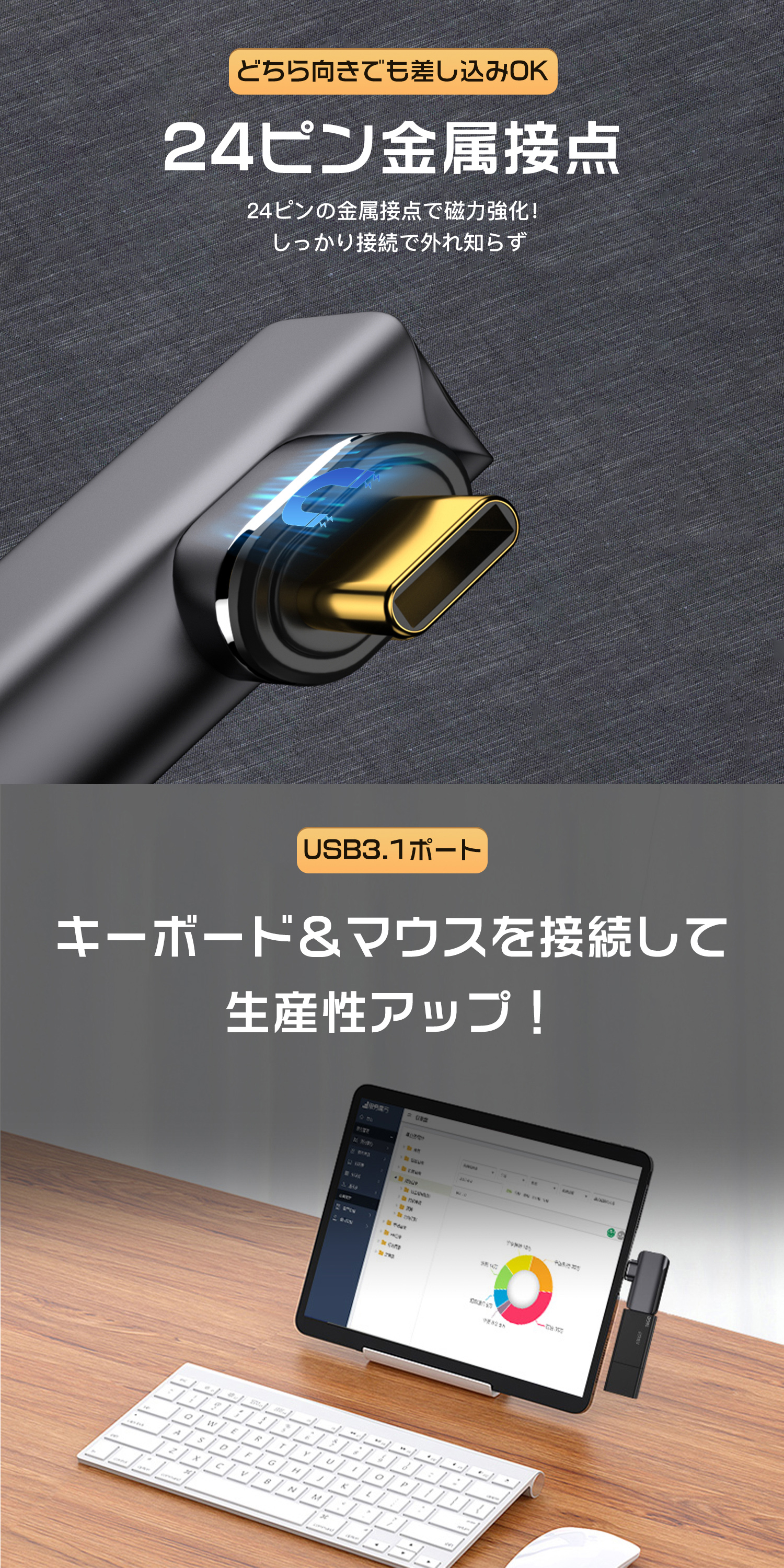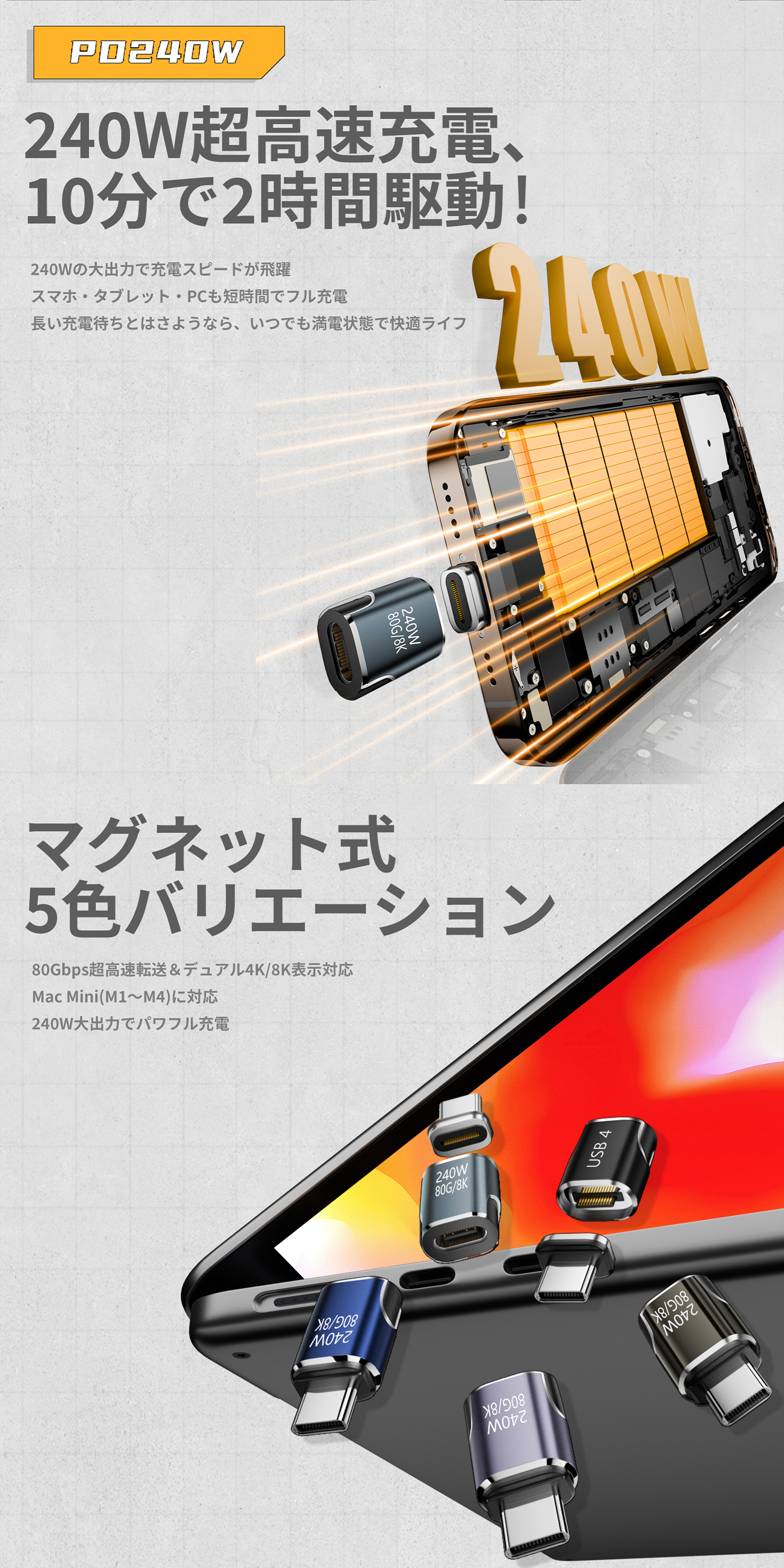 磁石の力で簡単に接続でき、繰り返しの抜き差しによる機器の損傷を防ぎます。24ピン設計により、PD最大240Wの急速充電と最大40Gbpsの高速データ転送が可能なUSB-C対応の変換アダプタです。