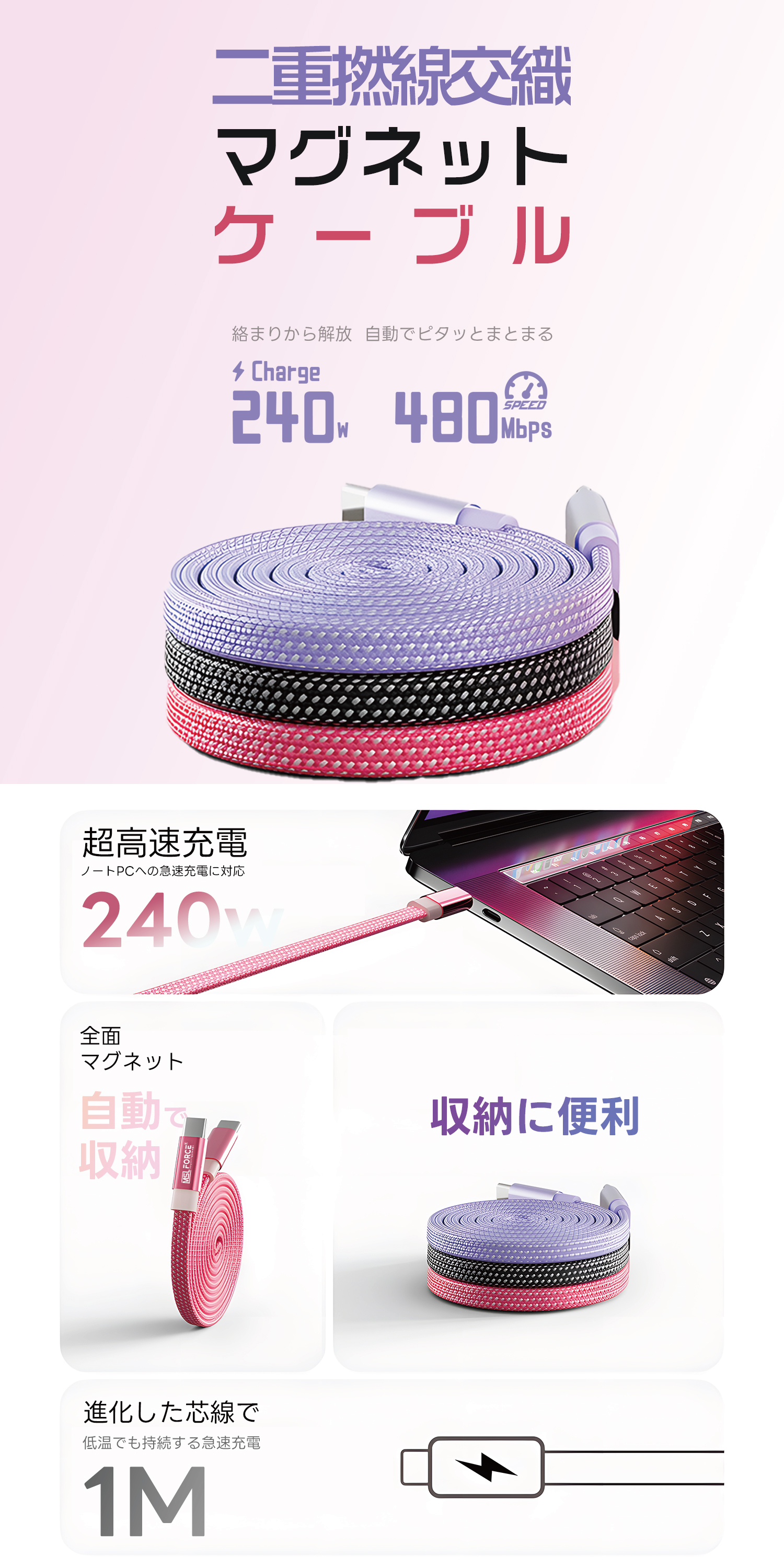 高品質ナイロン編みを採用し、しなやかで柔らかい手触り。耐久性に優れ、絡まりにくくストレスフリーで使用できます。■マグネット内蔵・自動収納