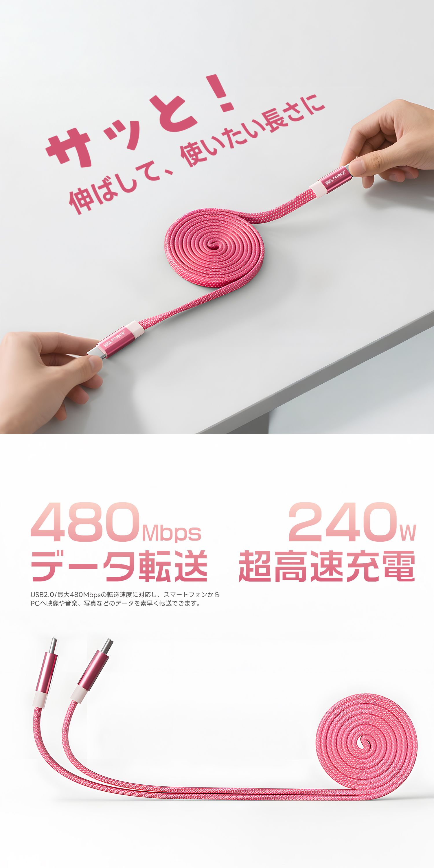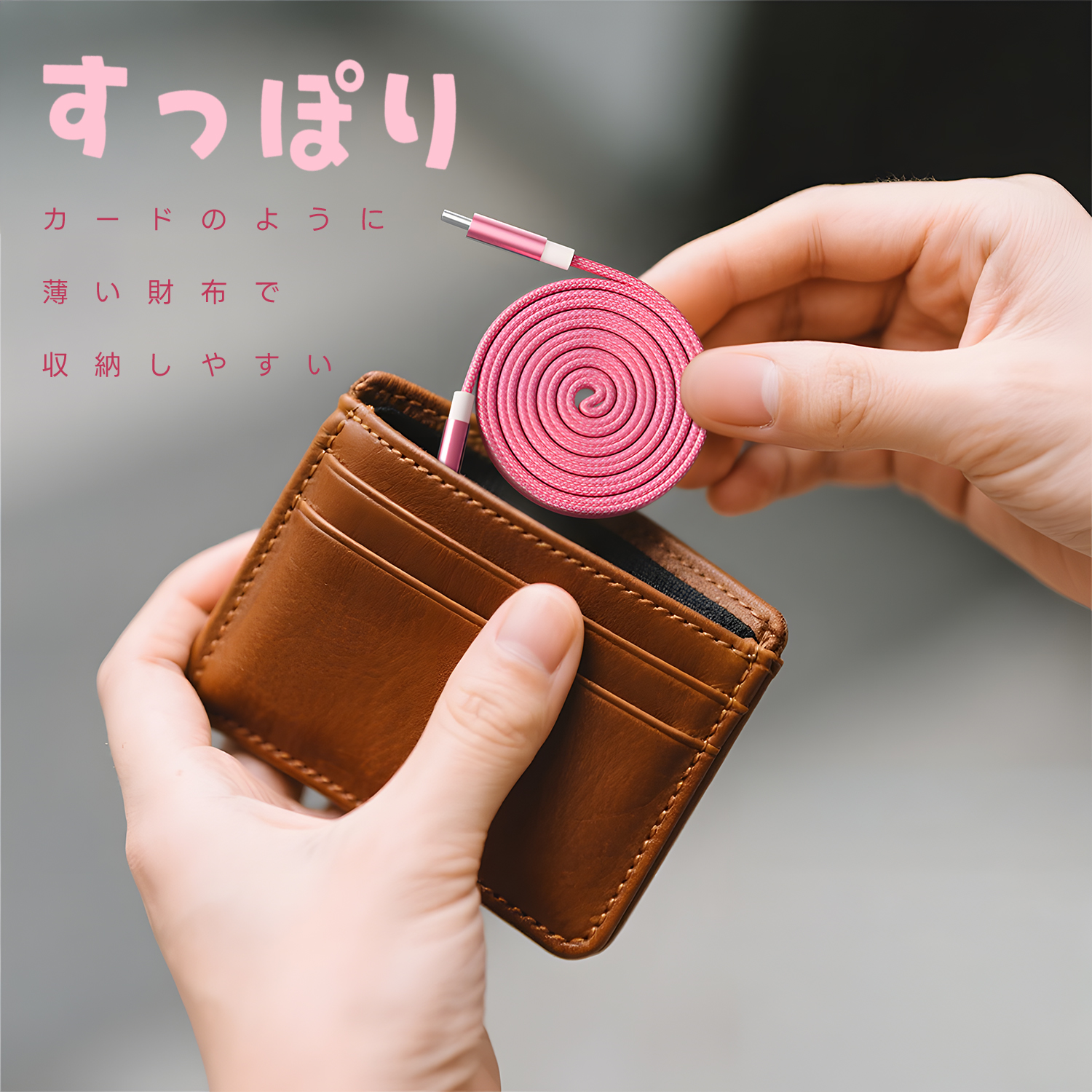長すぎず短すぎない1mのケーブルは、デスクワークやベッドサイド、持ち歩きにも最適。日常のさまざまなシーンで活躍します。