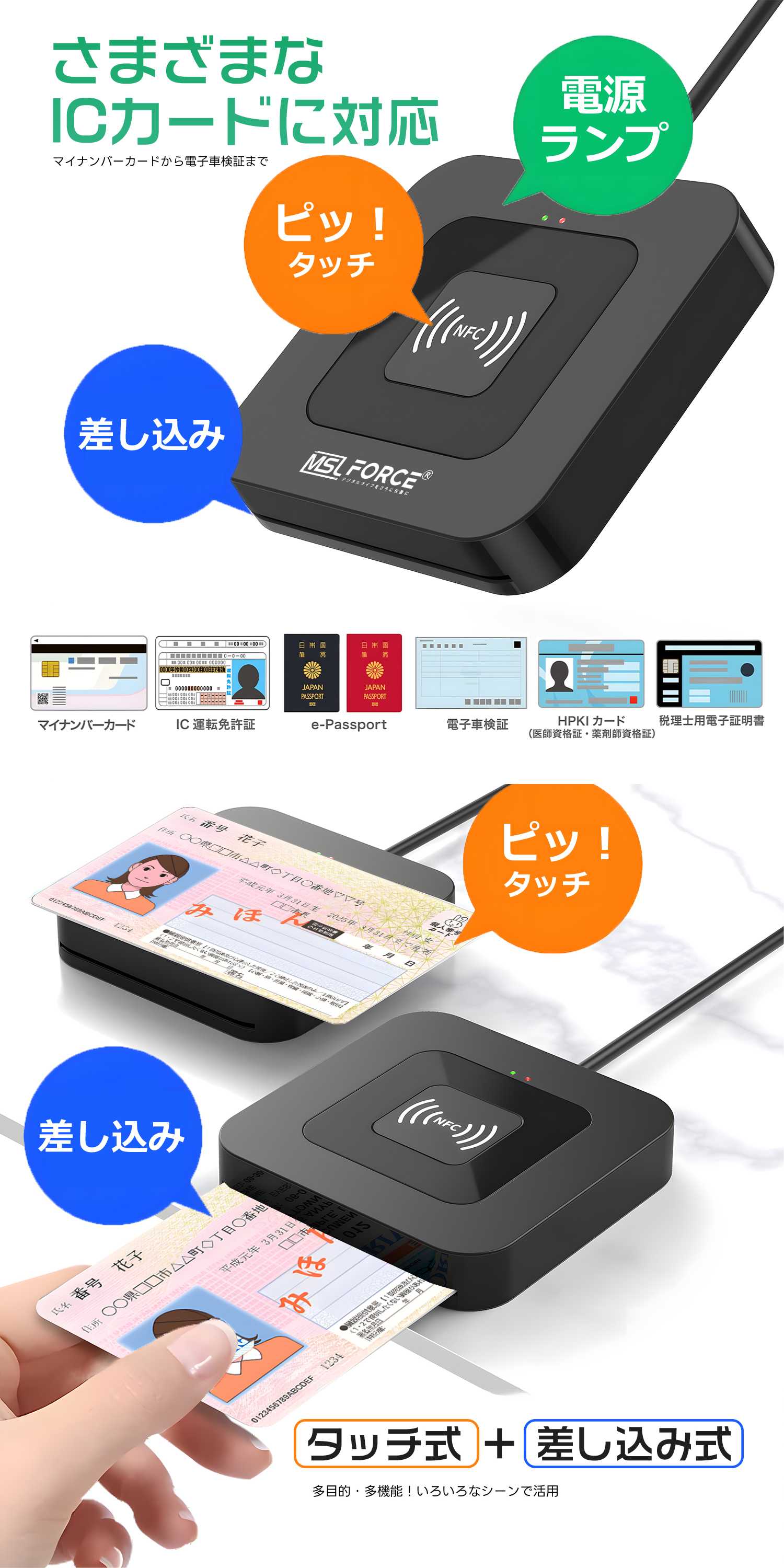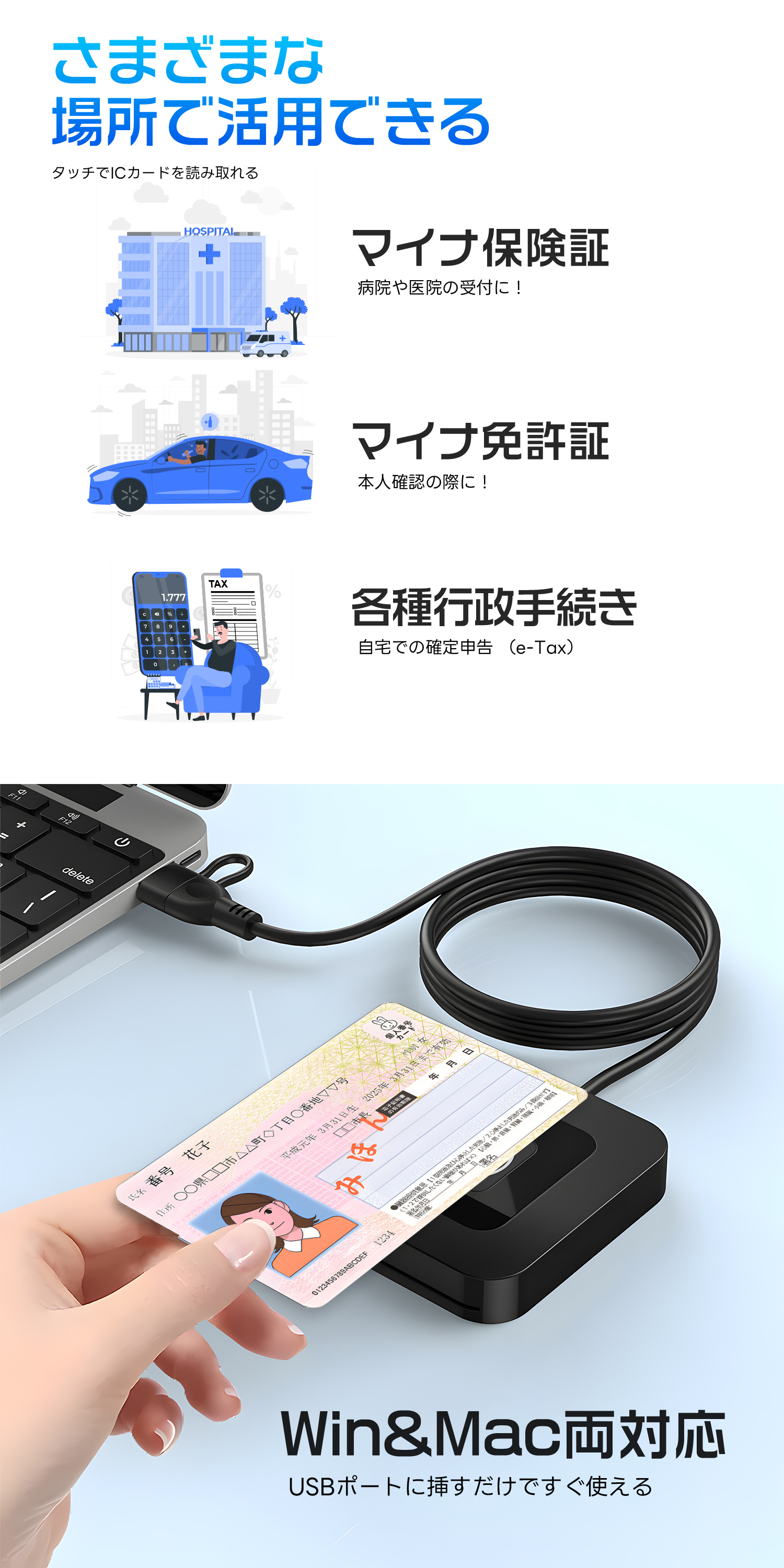 銀行、郵便局、全国で発行されたICチップカードをサポートします。マイナンバーカード、電子申告(e-Tax)確定申告、住民基本台帳カード、CAC(Common Access Card)、政府ID、国民ID、B-CASカード、税理士カードに使用できます。オンラインバンキングやデジタル署名アプリケーションなどのすべ ての連絡先スマートカードに操作可能:AKO、OWA、DKO、JKO、NKO、ActivClient、BOL、GKO、Marinenet、AF Portal、Pure Edge Viewer、ApproveIt、DCO、DTS、LPS、Disa Enterpriseメールなど。※接触型ICカード身分情報や財務情報を読み取る場合、第三者のシステムを連携して使用する必要があります。