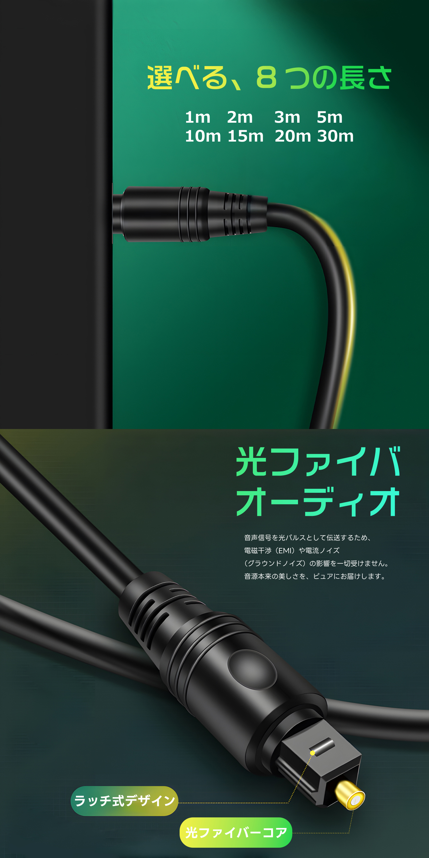 光ファイバーコアを採用し、電磁干渉(EMI)や電流ノイズの影響を受けないクリアで純粋なサウンドを実現。映画・ゲーム・音楽などあらゆるシーンで高品質な音声を楽しめます。