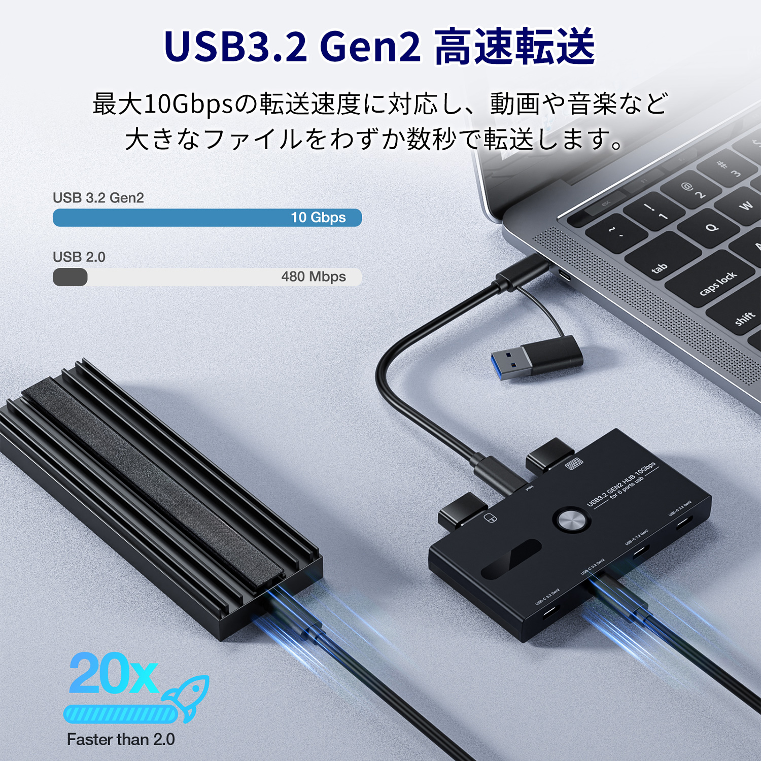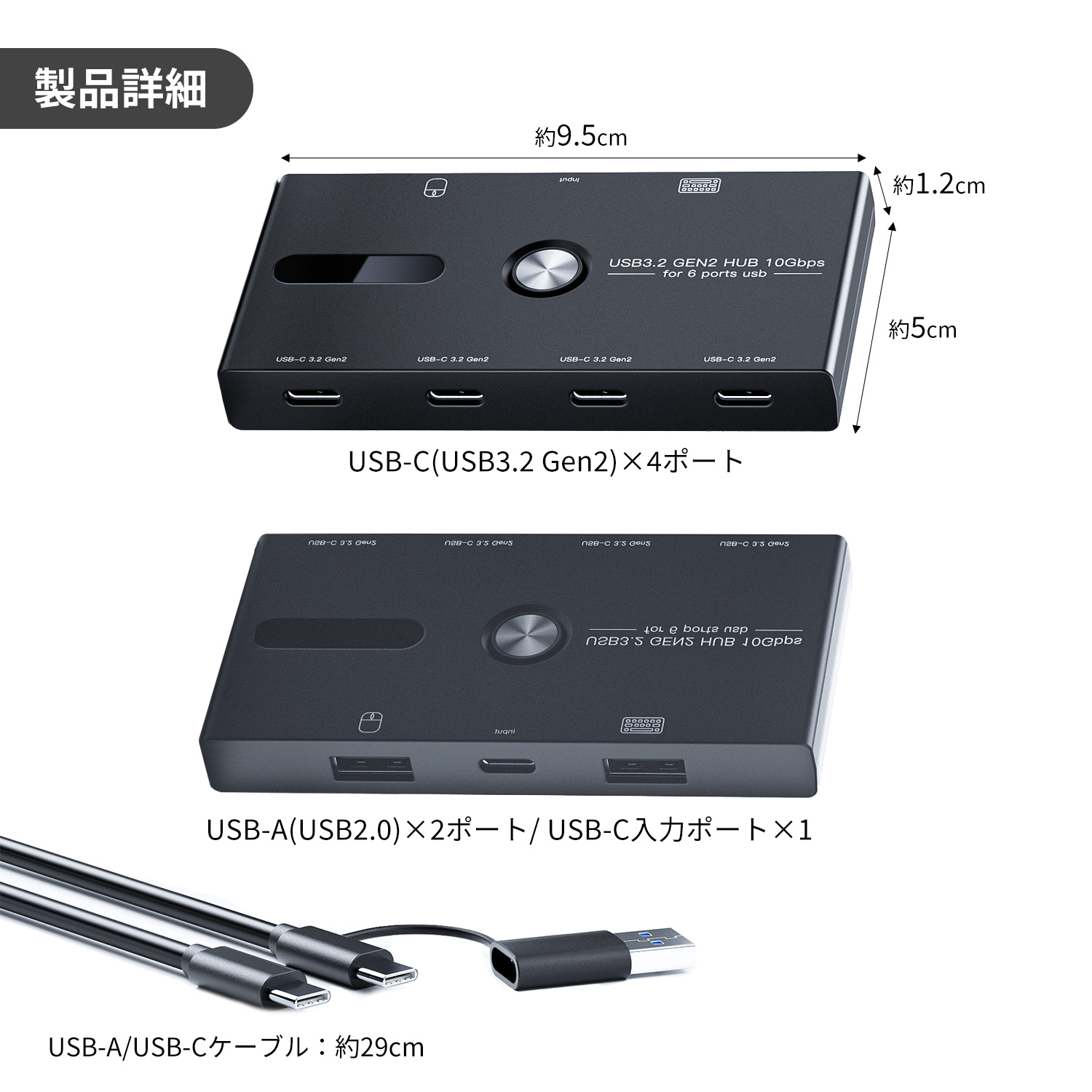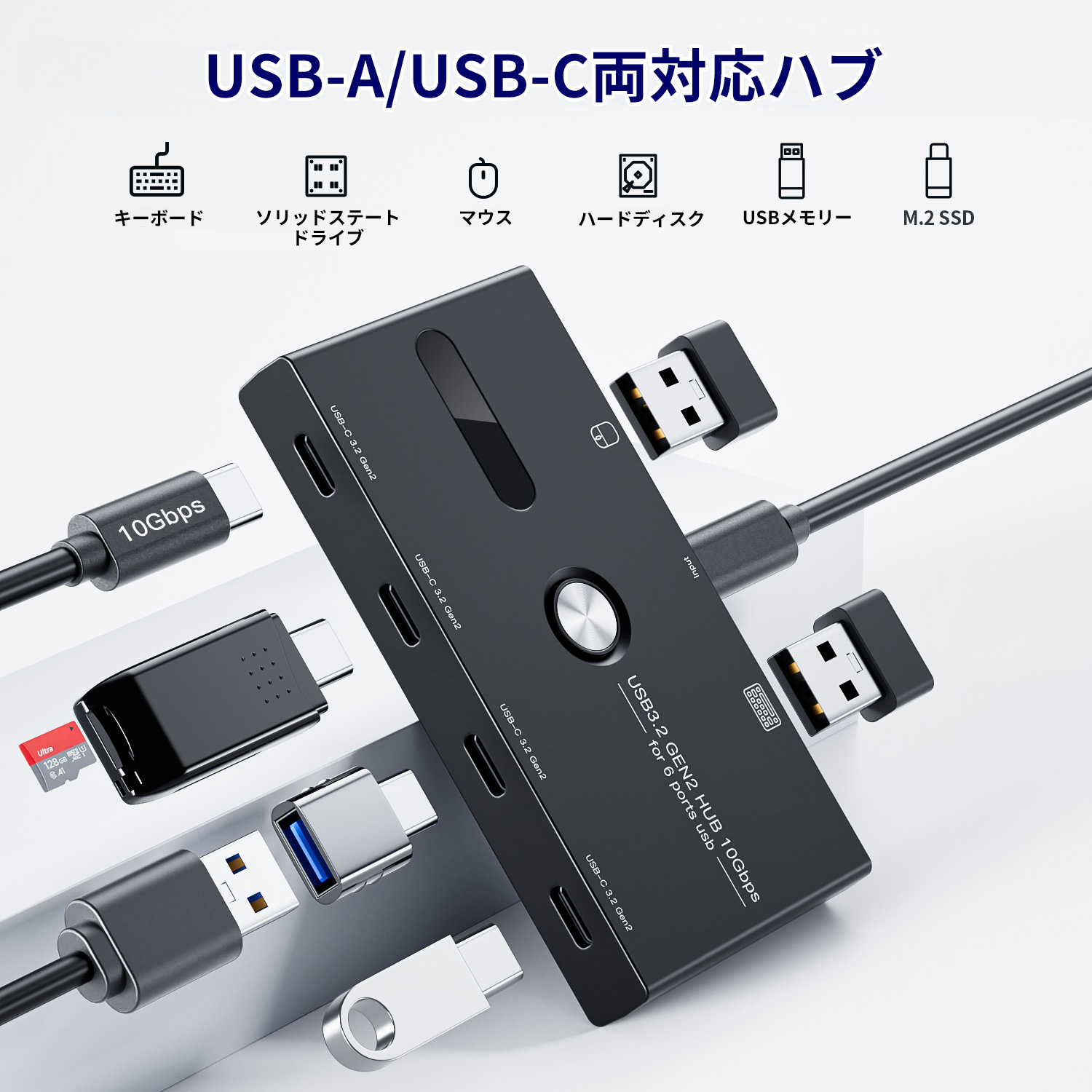 USB3.2 Gen2規格のデータ転送が可能なUSB-Cポート4つとUSB2.0規格のキーボードやマウスを接続可能なUSB-Aポートを2つ搭載した6in1ハブです。USB-A/USB-C両対応のケーブルが付属している為、幅広いデバイスに対応します。