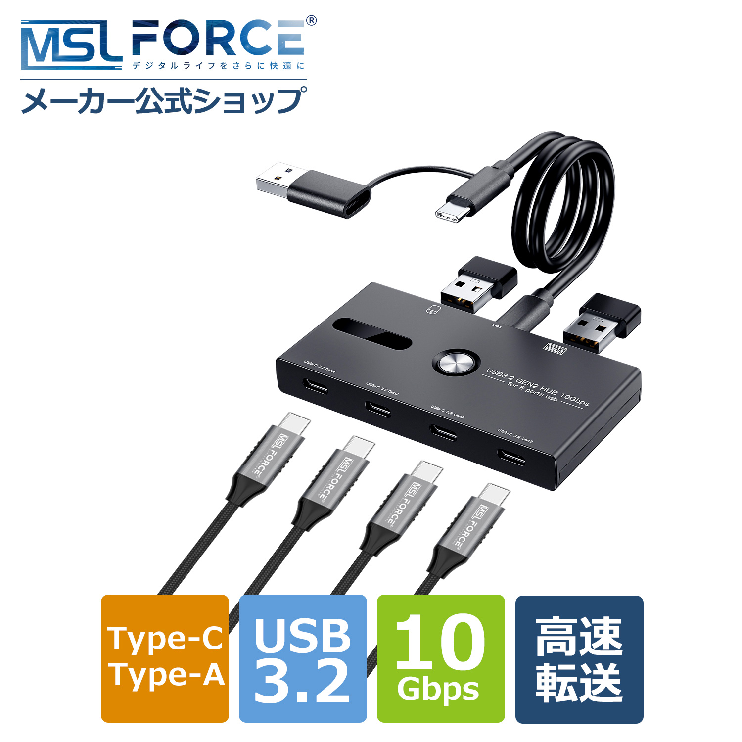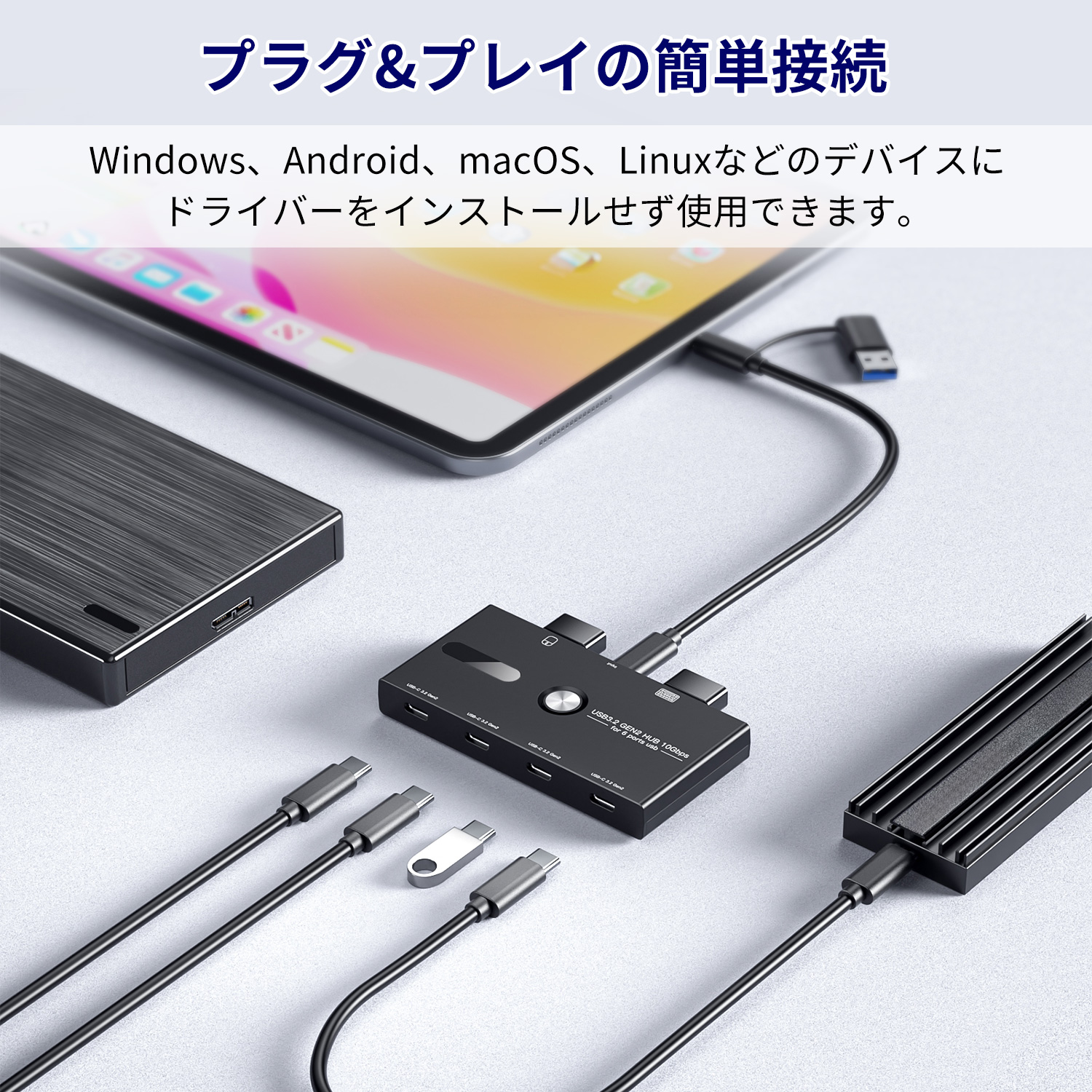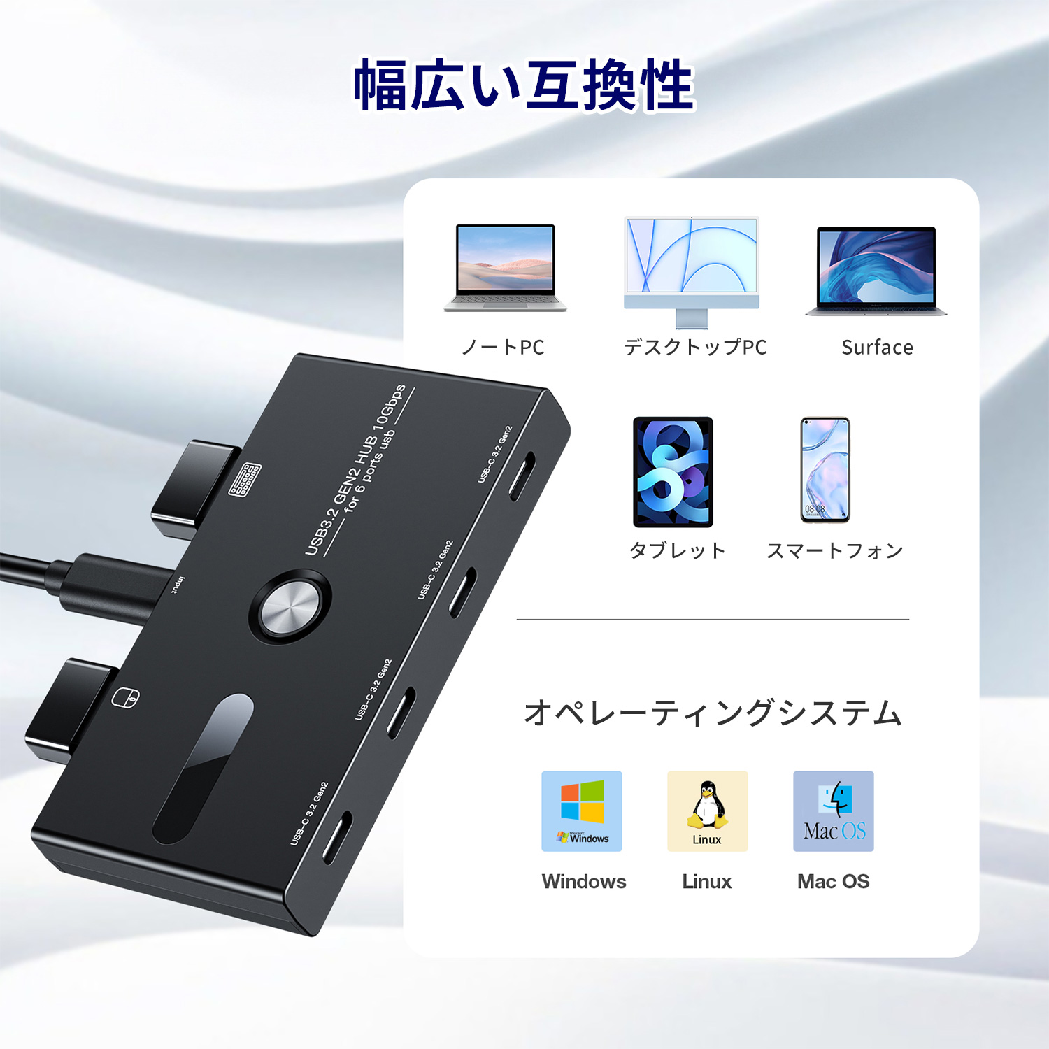 USB3.2 Gen2規格のデータ転送が可能なUSB-Cポート4つとUSB2.0規格のキーボードやマウスを接続可能なUSB-Aポートを2つ搭載した6in1ハブです。USB-A/USB-C両対応のケーブルが付属している為、幅広いデバイスに対応します。