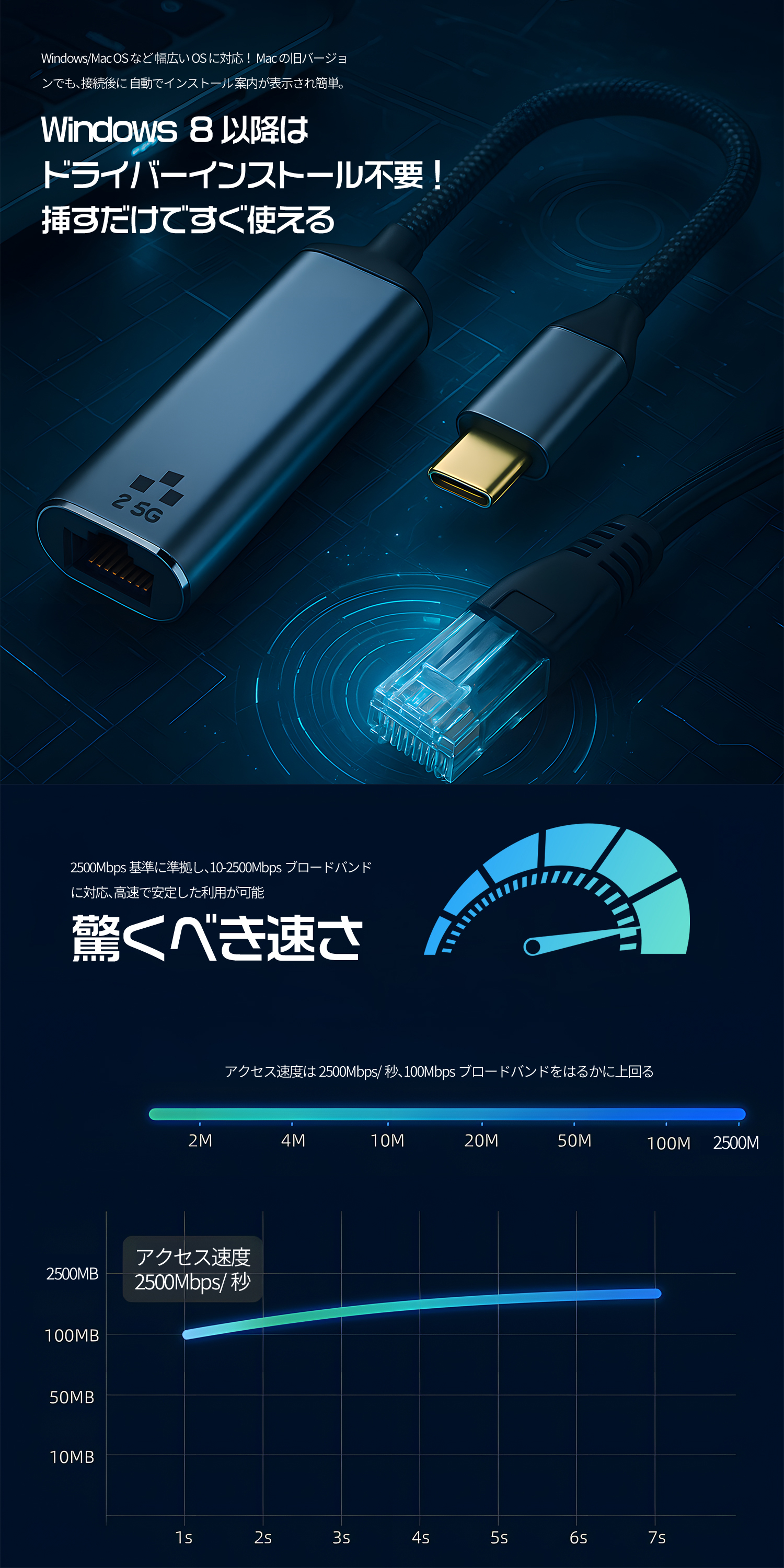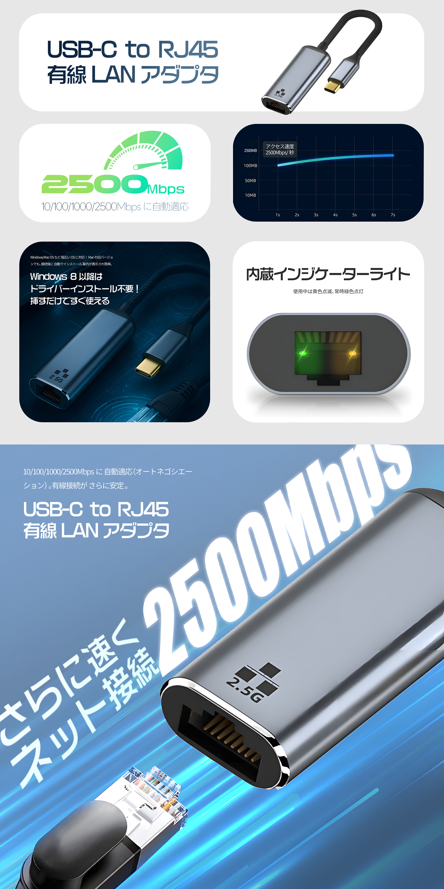 ■USB-C to RJ45有線LANアダプタ ギガビットイーサネット対応で最大1000Mbpsの高速通信が可能です。有線での接続を行うことで安定したネットワーク通信ができ、Wi-Fiが不安定な時でも動画の視聴やゲームなどを快適に楽しむことができます。