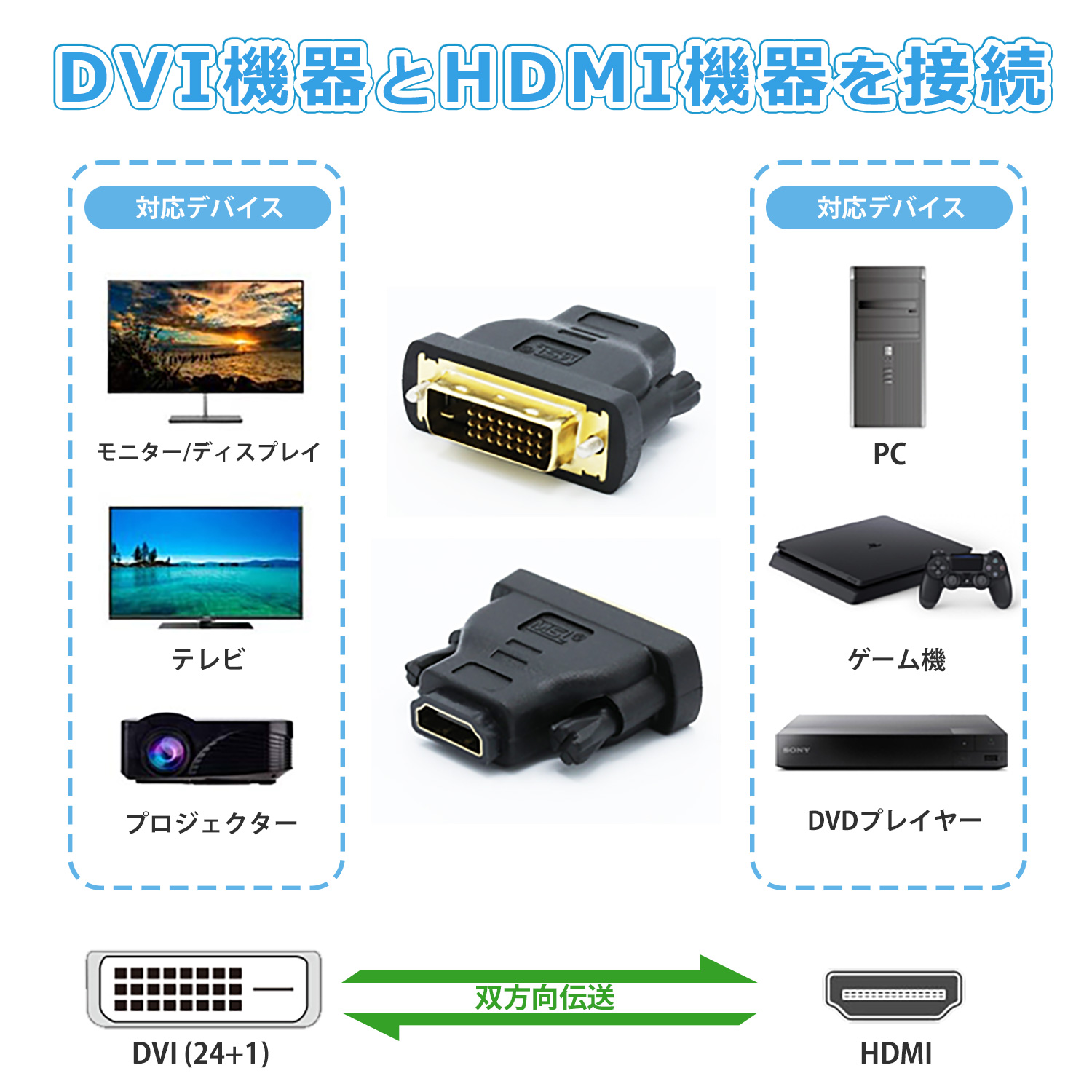 HDMI端子を持つパソコン等とDVI端子を持つ液晶モニター等の接続を可能にし、大画面でハイビジョンの動画やゲーム等を映られます。ホームシアター、会議室、教室等色んな所で活躍しています。