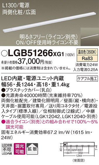 パナソニック LGB51266 XG1 天井・壁直付型・据置取付型 LED 温白色 スリムライン照明 拡散型 両側化粧 広面 電源投入型 調光型 L1300タイプ