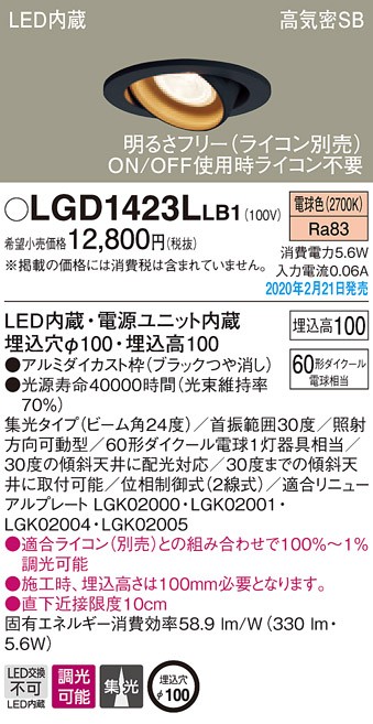 パナソニック LGD1423L LB1 LED 電球色 ユニバーサルダウンライト 浅型10H 高気密SB形 集光型 調光型 埋込穴φ100 110Vダイクール電球60形1灯相当