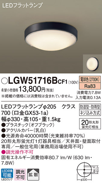 パナソニック LGW51716B CF1 天井・壁直付型 LED 電球色 シーリングライト 拡散タイプ 防湿・防雨型 丸形蛍光灯20形1灯器具相当 ランプ付(同梱)