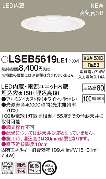 パナソニック LSEB5619 LE1 天井埋込型 LED 温白色 ダウンライト 浅型8H 高気密SB形 拡散タイプ 埋込穴φ150 白熱電球100形1灯器具相当
