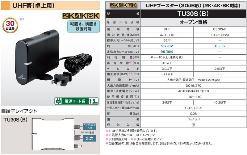 DXアンテナ TU30S(B) UHFブースター 30dB形 卓上用 2K・4K・8K対応