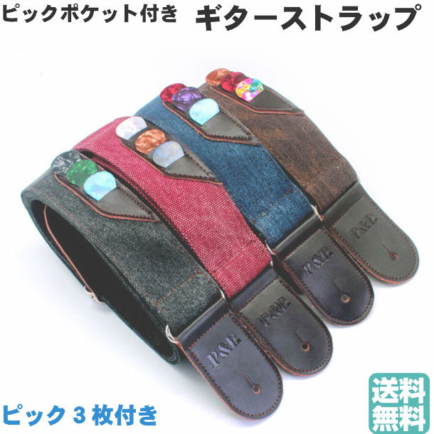ギターストラップ ピックポケット付き デニム ピック3枚付き ギターストラップ P&P