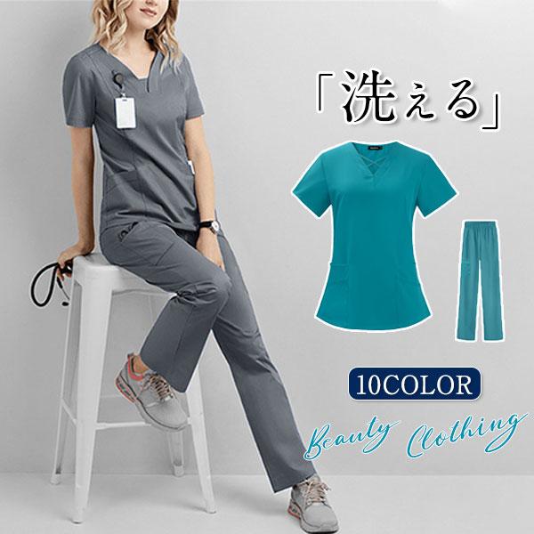 ナース服 スクラブ 白衣 レディース 上下セット セットアップ 女性用 半袖 制服 看護師 介護士 病院 無地 医者 快適 春秋 夏物 洗える