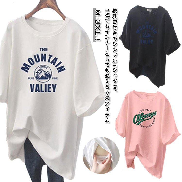 ロングTシャツ トップス チュニック 産前産後兼用 可愛い 授乳 春夏 半袖 クルーネック インナー 授乳Tシャツ マタニティ 授乳服 授乳服 授乳ウ