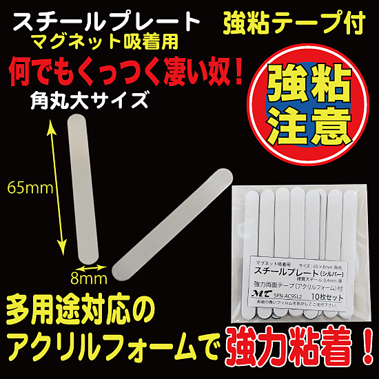 スチールプレート 角丸65×8mm(マグネット吸着用)シルバー 強力シール付 10枚入 AC09