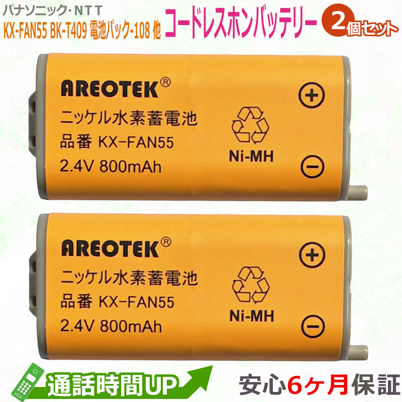 KX-FAN55(2個セット)Panasonic コードレスホン子機用電池パック BK-T409 同等品 NTT CT-電池パック-108【純正品と完全互換 】AREOTEK