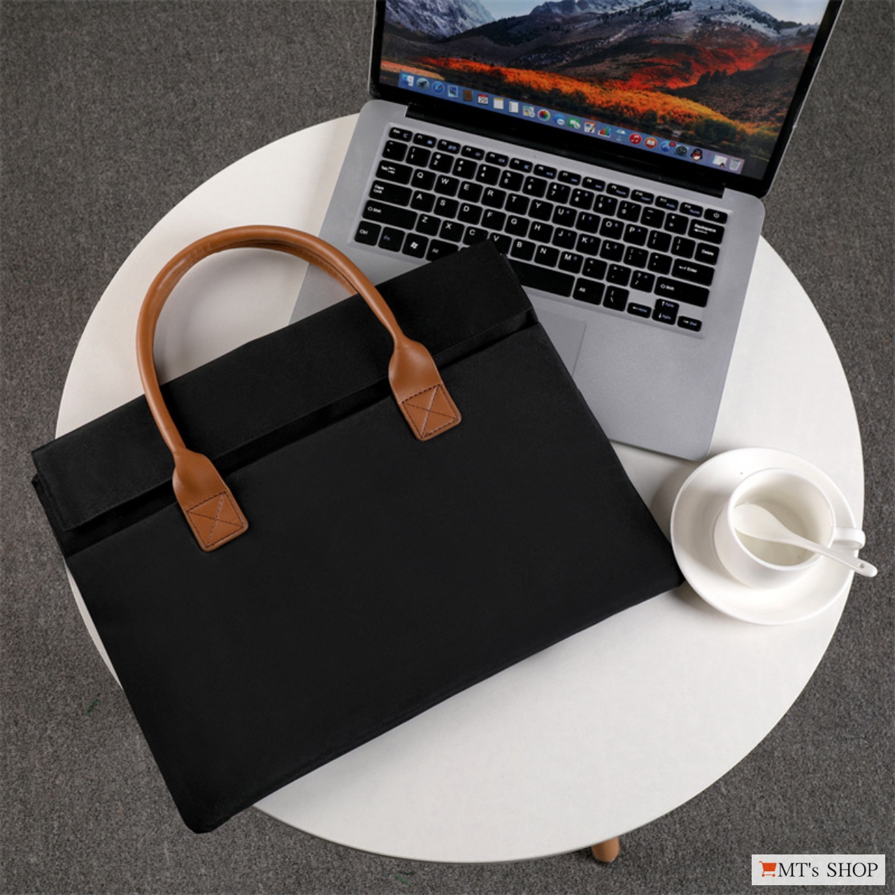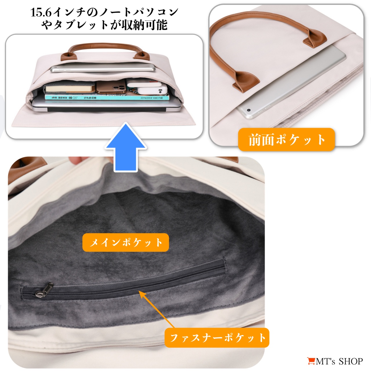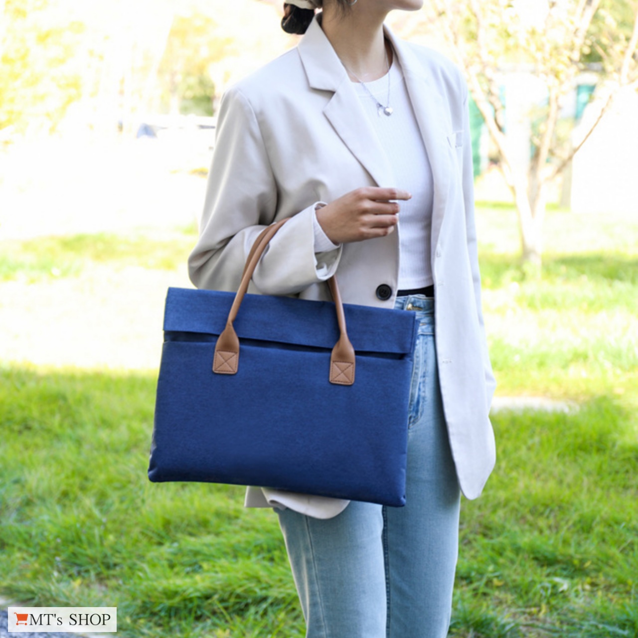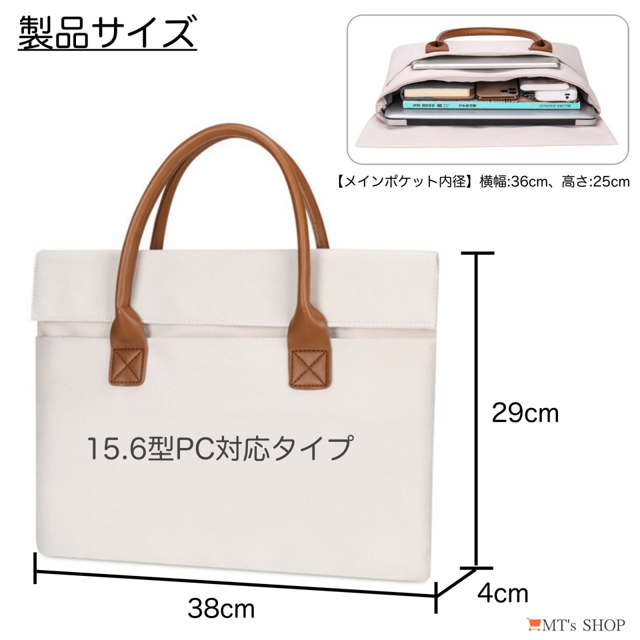 ![]() ![]() ビジネス移動に合う落ち着いたデザインの、15.6インチのノートパソコンが収納可能な薄型ビジネスバッグ、ノートパソコンバッグです。 革のような取っ手を採用した大人なデザインで、メンズ・レディースを問わず、男女兼用で使えます。 革製のかばんに比べて軽量性と機動性に優れており、ビジネス移動や通勤、通学に最適です。 ![]() ![]() 高密度なオックスフォード生地は撥水性に優れており、やや硬めの生地は耐摩耗性に優れており丈夫なのが特徴です。 内側は柔らかく起毛された表面で、なめらかでしっとりとした触り心地のいいベルベット生地が使用されており、収納した機器を傷から守ってくれます。 生地の間にクッション性のある素材が挟み込まれており、衝撃を吸収してくれます。 持ち手は革風のしっかりした素材で、重い荷物にも耐えられる仕様です。 ![]() ![]() 【開口部】カバーのフラップ部分に隠しマグネットボタンが搭載されており、開閉しやすくサッと取り出しやすいデザインです。 【外側ポケット】前面のカバー内側に隠しマグネット開閉のポケットが1つあり、マウス、ACアダプタ、ヘッドセットなどの収納に便利です。 【内側ポケット】ファスナーポケットが1つあり、貴重品や荷物がごちゃごちゃにならず、整理整頓に便利な機能性の高い仕様です。 【メインポケット】A4ファイルや15.6インチのノートパソコンが収納可能です。ポケット内部はクッション性があり、内側生地は表面のパイルがパソコンが傷つくのを防いでくれます。 ![]() ![]() 【メイン素材】: 表面生地:オックスフォード(ポリエステル) / 裏面生地:ベルベット(ポリエステル) 【本体サイズ】:横幅:38cm、高さ:29cm、厚み:4cm (15.6型対応タイプ) 【メインポケット内径】:横幅:36cm、高さ:25cm 【重量】: 370g 【ポケット数】:前面:マグネット開閉ポケット x1 / 内側:ファスナーポケット x1、メインポケット x1 ※「MT's SHOP」は商標登録第6122480号により特許庁を通じ商標権(第35類)を取得しております。 |