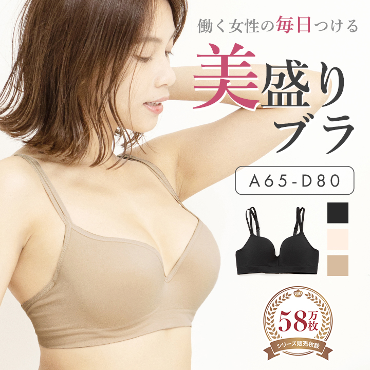 | 毎日使いたい美シルエットブラ! シリーズ累計枚数50万枚突破の美盛り(R) シリーズのブラジャータイプ。 楽ちんなのにしっかり美盛り。 つるんとしたモールドカップタイプのブラなので、Tシャツはもちろんの事様々なトップスに響かず着用することができます。 洗濯後もすぐ乾く、吸水速乾性の生地を採用。ムレを防止して1日中快適にお過ごしください! ワイヤー部分の上にストレッチ素材をかぶせ、縫い合わせをせず二層にすることで身体の動きにしっかりフィット。 | |||||||||