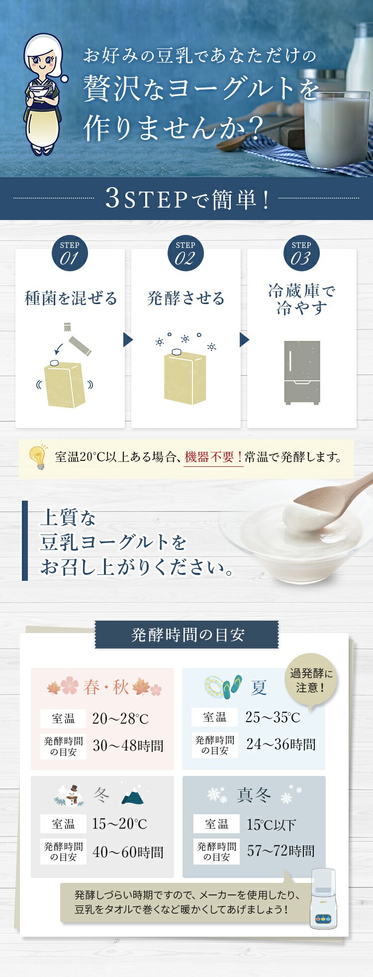 | 国産原料・乳酸菌を大切にし、豆乳で簡単に作れる「手作り発酵体験」を楽しんでいただきたいです。 乳製品が苦手な方でも安心して続けられる、まろやかでやさしい味わいのヨーグルトをお届けします。 続けることで腸内調整や健康習慣のきっかけになれば嬉しいです。 |