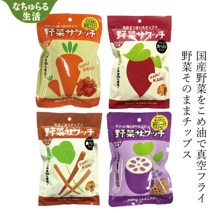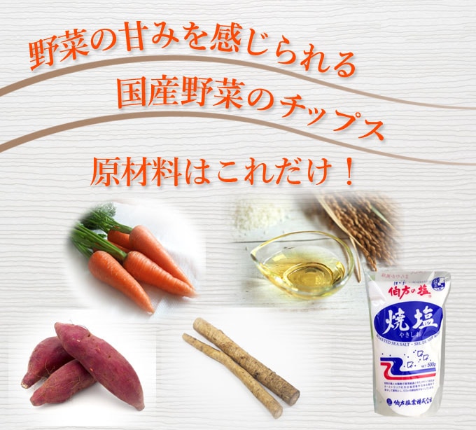 【にんじんチップス】にんじん(国産)、こめ油 【さつまいもチップス】さつまいも(国産)、こめ油、食塩 【ごぼうチップス】ごぼう(国産)、こめ油、食塩 【レンコンチップス】れんこん(国産)、こめ油、食塩 |