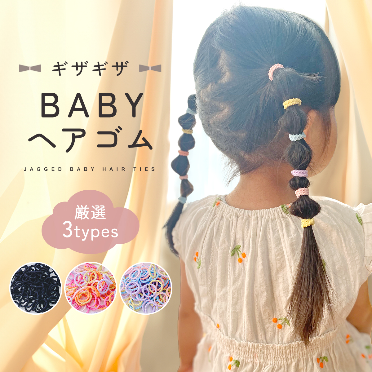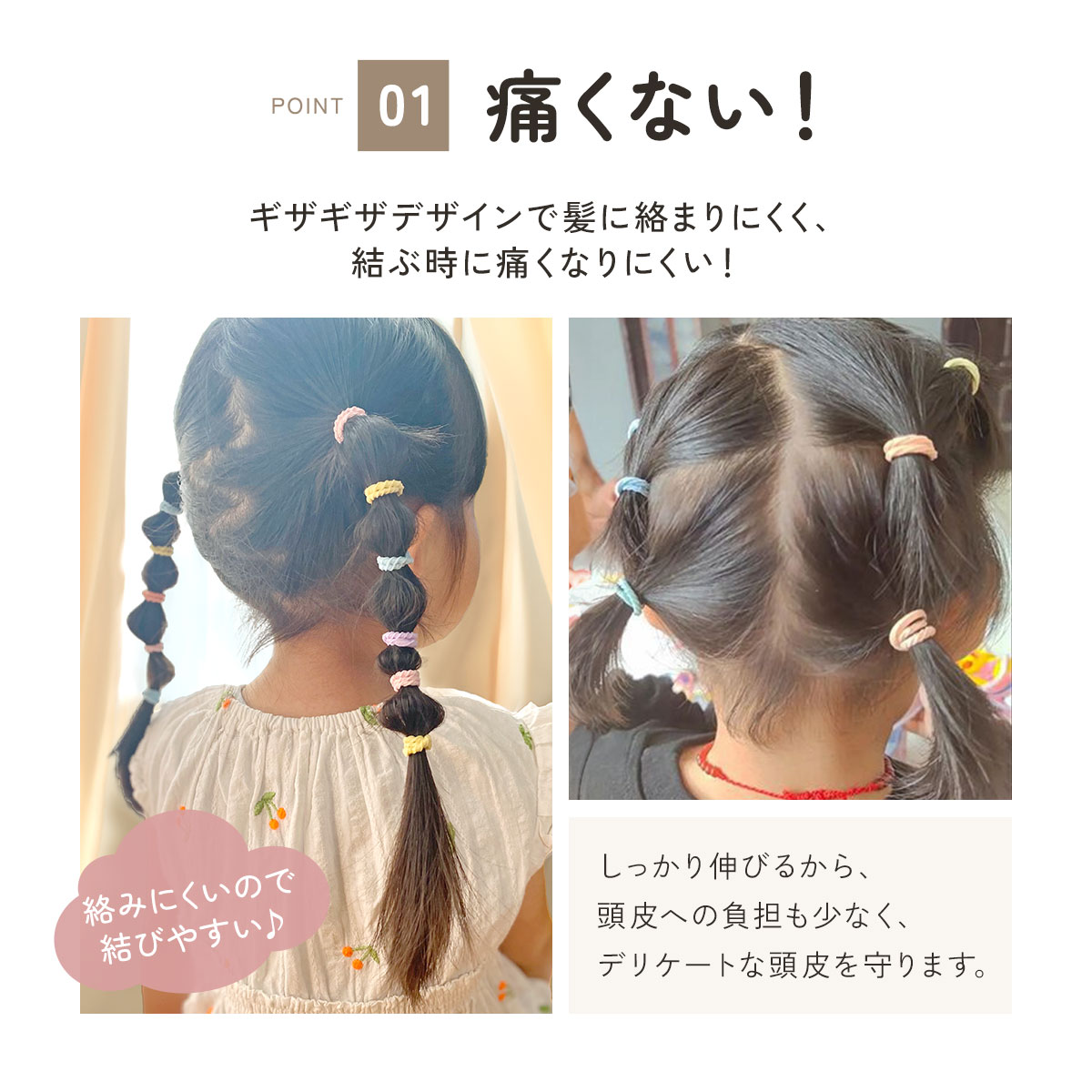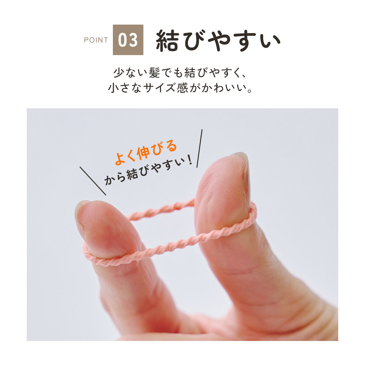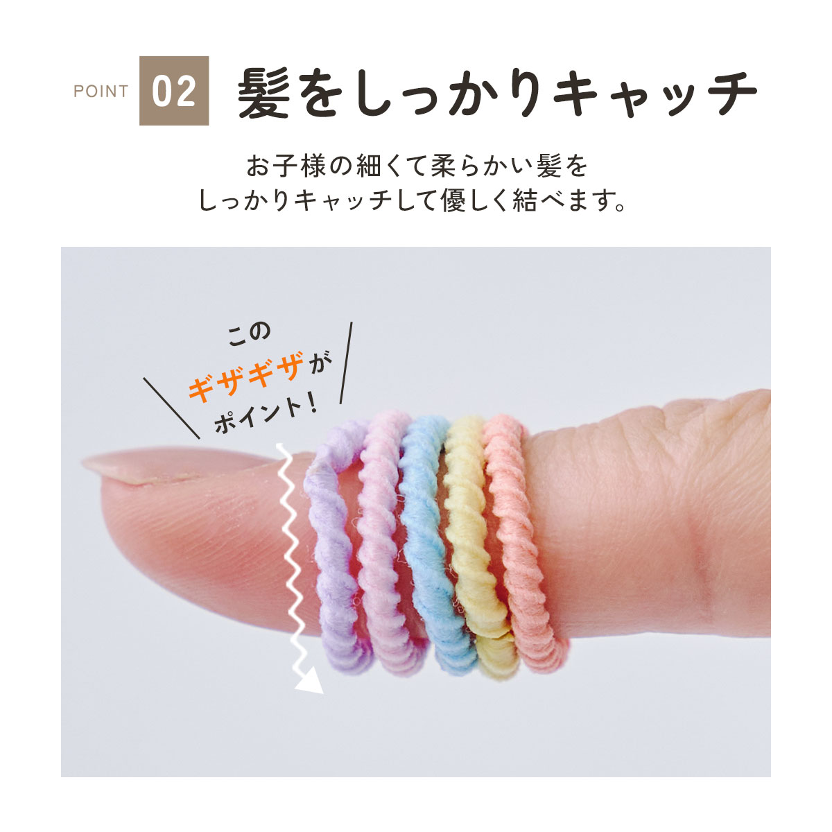 お子様の細くて柔らかい髪をしっかりキャッチして優しく結べます