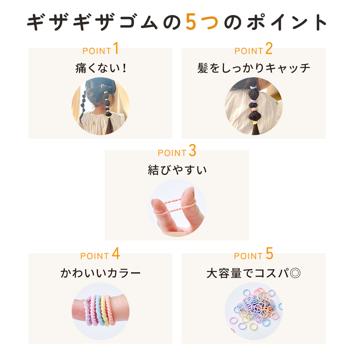 ギザギザデザインで髪に絡まりにくく、結ぶ時に痛くなりにくい!