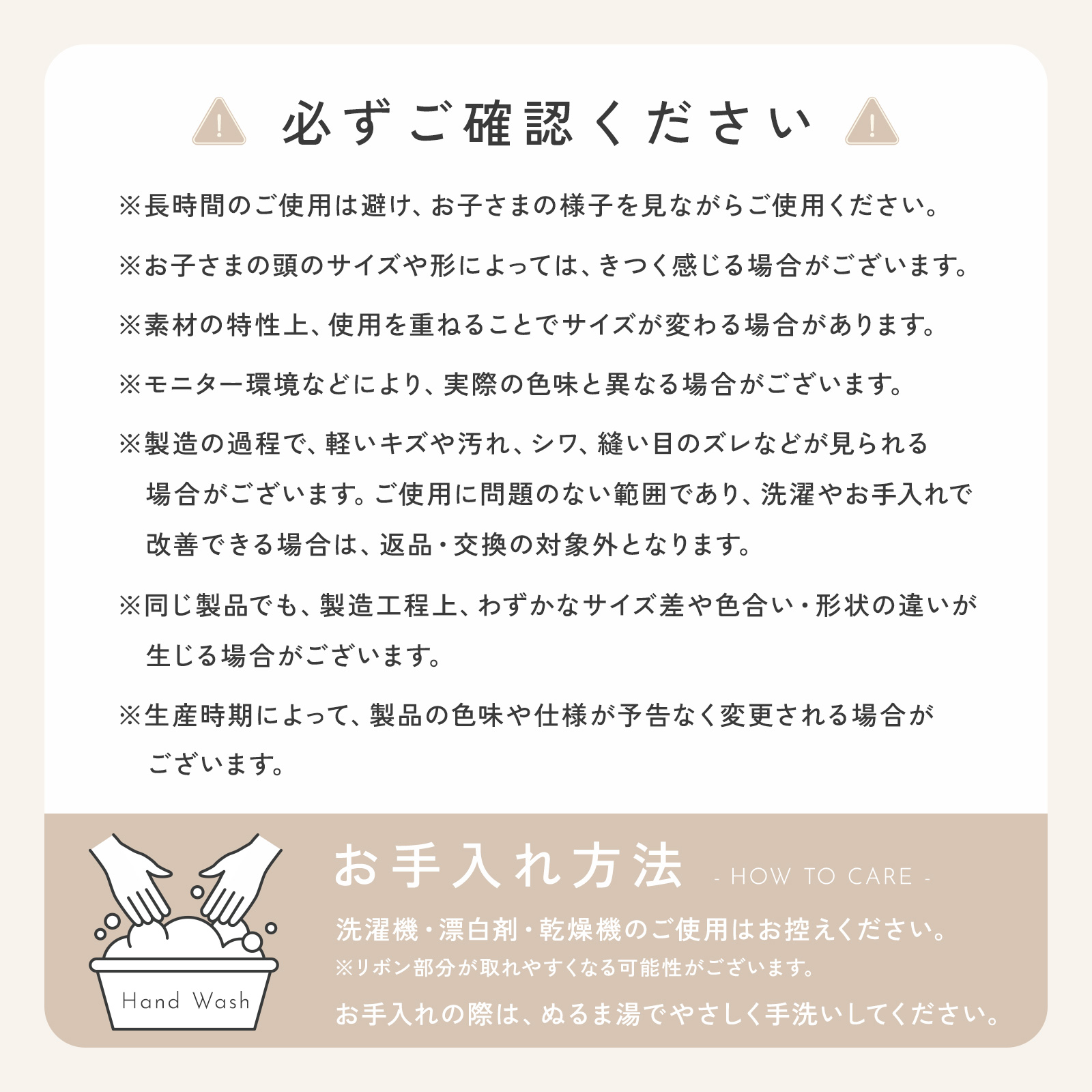 お手入れの際は、ぬるま湯でやさしく手洗いしてください。