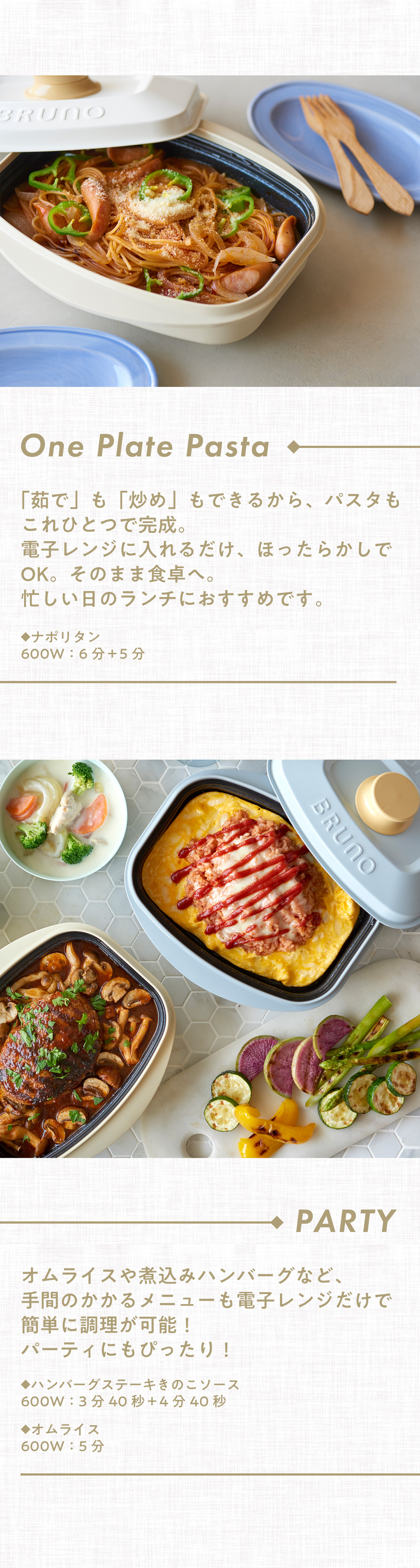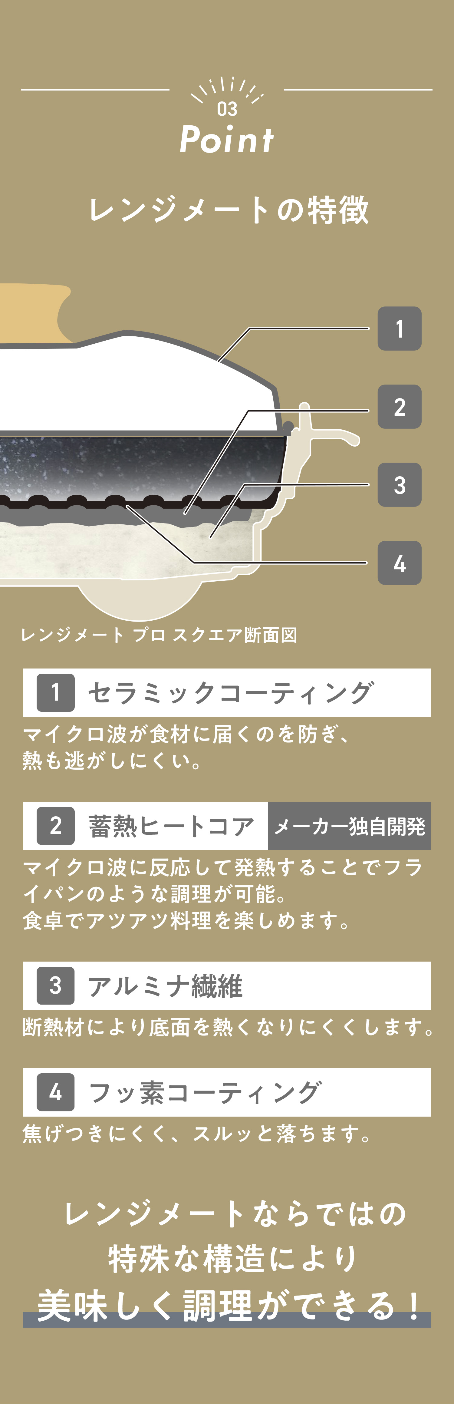 | 禁止事項 | ご使用の際は、取扱説明書をよくお読みの上、正しくお使いください。 本製品は電子レンジ専用調理器です。直火にかけないでください。 ※自動調理機能が付いた電子レンジで使用する際には、オーブン機能・グリル機能・メニュー別自動調理機能(オート機能)等では使用しないでください。 本製品の故障、発火の原因となる恐れがございます。 洗う時は底を水に浸すこと・つけ置き洗いをしないでください。 ※本体が水没し、本体底部の穴から水が浸水した場合、調理ができなくなり製品破損の原因となります。 コーティングが傷んで焦げ付く原因になるため、金属類や高温のお湯等は使用せず、本体を十分冷ましてからやわらかいスポンジとキッチン用中性洗剤等を利用ください。使用中のガスコンロの近くに本製品を置かないでください。 使用中のガスコンロの近くに本製品を置かないでください。 使用直後のIHコンロの上に本製品を置かないでください。 輸送時に、底の脚部分に多少の擦れが生じる場合がありますが、品質に問題はございません。 注意書き及び 取扱説明書記載 の「禁止事項」に反した結果、お客様が損害を負われても、当社は一切の責任を負いかねます。 ※画像・動画などはお客様使用モニターの発色により実際と異なる場合があります。 |