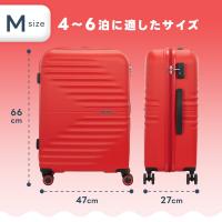 うねる(ツイスト)波(ウェーブ)をイメージしたスピード感を感じさせるデザインが特徴のシリーズ。American Trouisterの中では比較的軽量な点や、抗菌加工が施されたリサイクルポリエステルを使用した、環境配慮素材を使用している点がポイントです。使い勝手のいい凹凸のないTSAロックを搭載。スムーズに走行可能なダブルホイール。多段階プルハンドルでお好きな長さに調整可能です。 | アイテム | | ブランド | American Tourister アメリカンツーリスター | | 商品名 | TWIST WAVES SPINNER 66/24 TSA ツイスト ウェーブス Mサイズ | | カラー | ビビッド レッド:VIVID RED(QC6*00007) ユニバース ブラック:UNIVERSE BLACK(QC6*19007) ダークネイビー:DARK NAVY(QC6*41007) | | 仕様 | 種類:ハードケース(ファスナー) キャスター:4輪 TSAロック:あり(取り外し、南京錠としても使用可能です。) 多段階プルハンドル | | 旅行目安 | 4泊 5泊 6泊 | | 機内持ち込み | 非対応 | | 無料受託手荷物 | 対応 | | 素材 | 主素材:ABS 裏地:RECYCLEX 使用済PETボトルから作られたポリエステル素材 Microban 抗菌素材を使用 *抗菌加工はすべての菌に効果があるわけではございません *抗菌効果は永久的ではございません ※Microban 抗菌技術は、製品の使用者などを病原体となる微生物やウイルスから保護するように設計されていません。※使用後は、ほこりや軽い汚れは柔らかいブラシで払い落としてください。手あかなどの油性の汚れは、ブラシに中性洗剤(水カップ1:洗剤1・2滴)を含ませ、中に水が入らないよう注意して洗った後、柔らかい布で拭き取ってください。 | | サイズ | 幅:47cm×高さ:66cm×マチ:27cm | | 重さ/容量 | 約 3.5kg/約 60L | | 原産国 | CHINA |