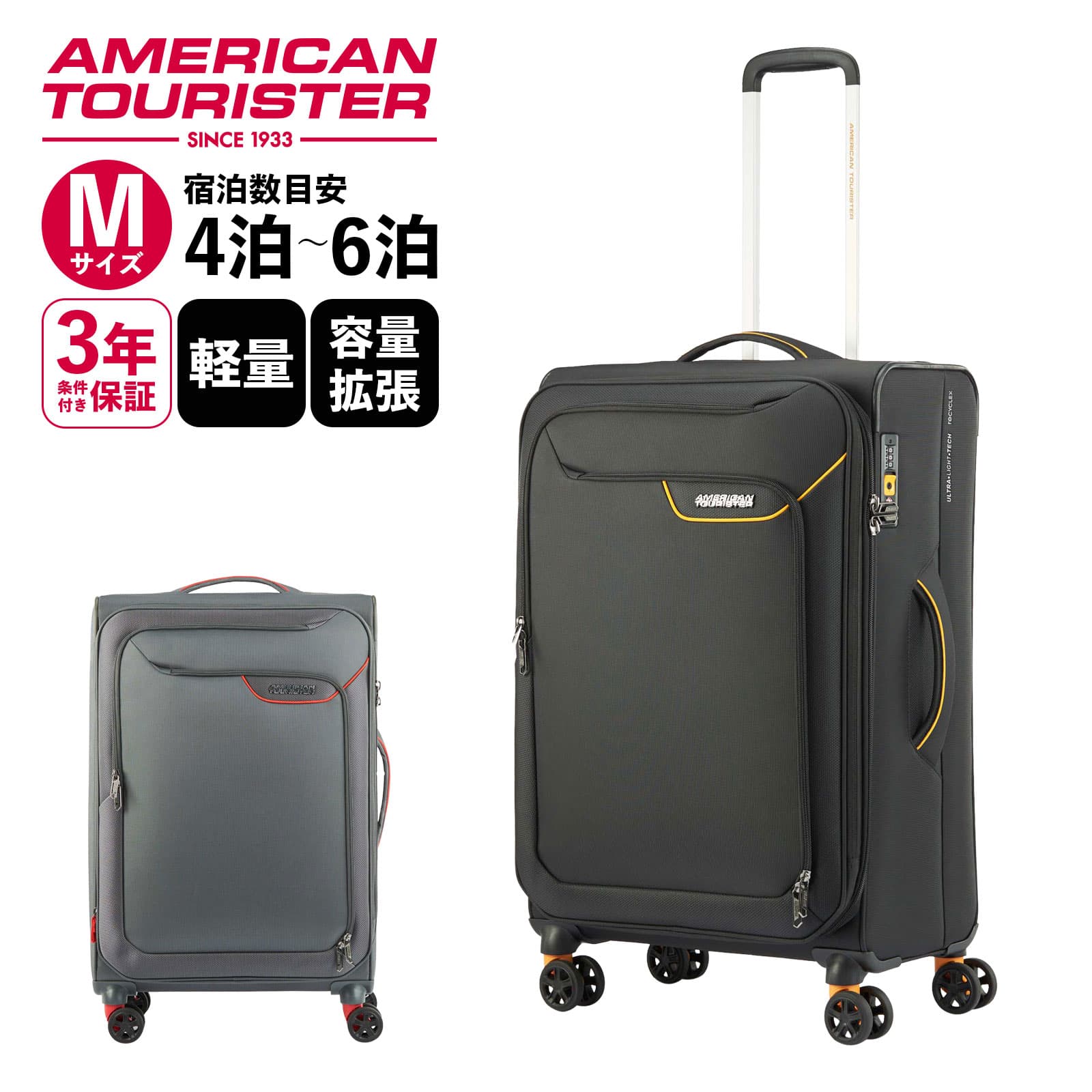 | アイテム | | ブランド | American Tourister アメリカンツーリスター | | 商品名 | APPLITE 4.0 SPINNER 71/27 EXP TSA アップライト 4.0 スピナー71 | | カラー | ブラック/マスタード:BLACK/MUSTARD(QJ6*C4003)グレー/レッド:GREY/RED(QJ6*68003) | | 仕様 | 種類:ソフトケース(ファスナー)フロントオープンキャスター:4輪TSAロック:あり多段階プルハンドル容量拡張 | | 旅行目安 | 4泊 5泊 6泊 | | 機内持ち込み | 非対応 | | 無料受託手荷物 | 対応 | | 素材 | リサイクルポリエステル | | サイズ | 幅:46cm×高さ:71cm×マチ:31-34cm | | 重さ/容量 | 2.6kg/76-85L |