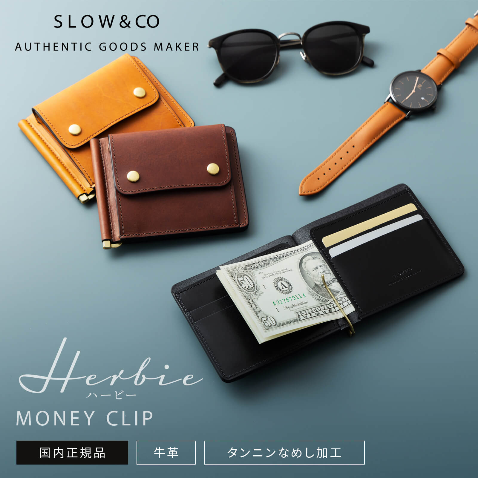 【牛革(カウレザー)】 もっとも多く市場に流通しているのが牛革(カウレザー)です。 美しい仕上がりと強度を兼ね備えているため、とてもポピュラーな革です。 | アイテム | | ブランド | SLOW スロウ | | シリーズ名 | HERBIE ハービー | | 商品名 | MONEY CLIP | | メーカー品番 | SO754I-2 | | カラー | ブラック:BLACK キャメル:CAMEL レッドブラウン:RED BROWN | | 仕様 | 札:1 小銭:1 カード:4 | | 素材 | COW LEATHER(山陽社製のフルベジタブルタンニンレザー) | | サイズ | 幅:11.5cm×高さ:9cm×マチ:2cm | | 重量/容量 | 約0.1kg | | 原産国 | 日本 |