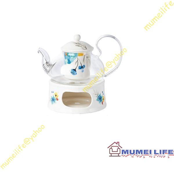 セラミック 茶器 ガラスポット ティーポット 透明 茶こし付き 花柄 蓋付き 燭台セット フランス風 水出し 断熱保温 おしゃれ 麦茶