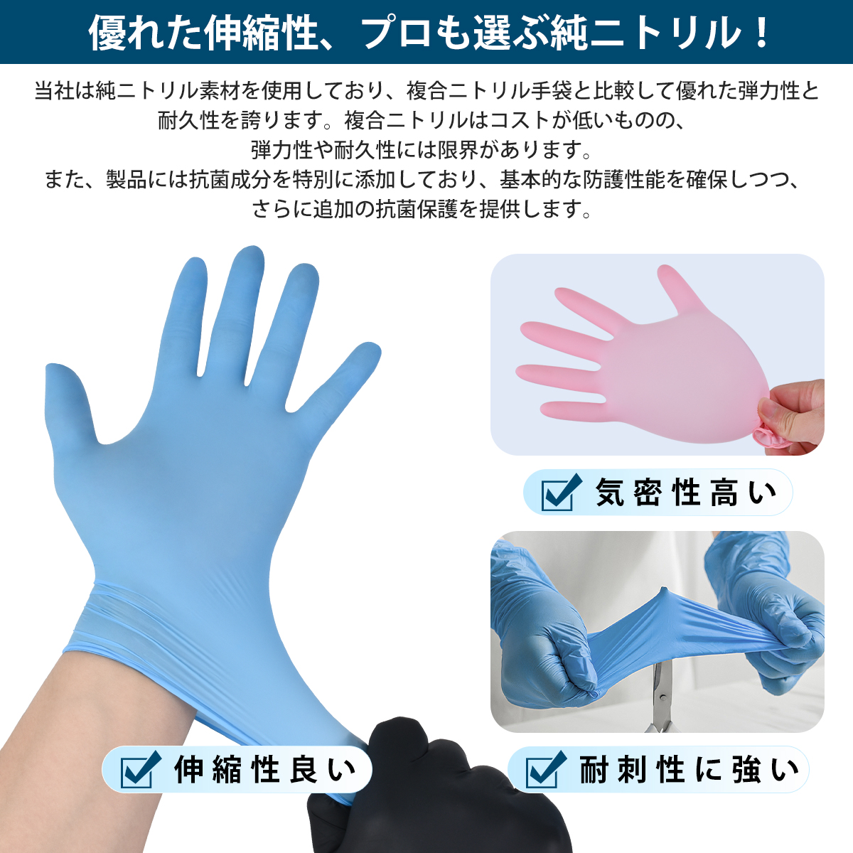 抗菌成分は手袋素材に安定的に配合されており、通常使用で簡単に落ちることはなく、作業中も持続的に効果を発揮します。また、外部からの汚染リスクを低減し、交差汚染を防ぐのにも効果的です。