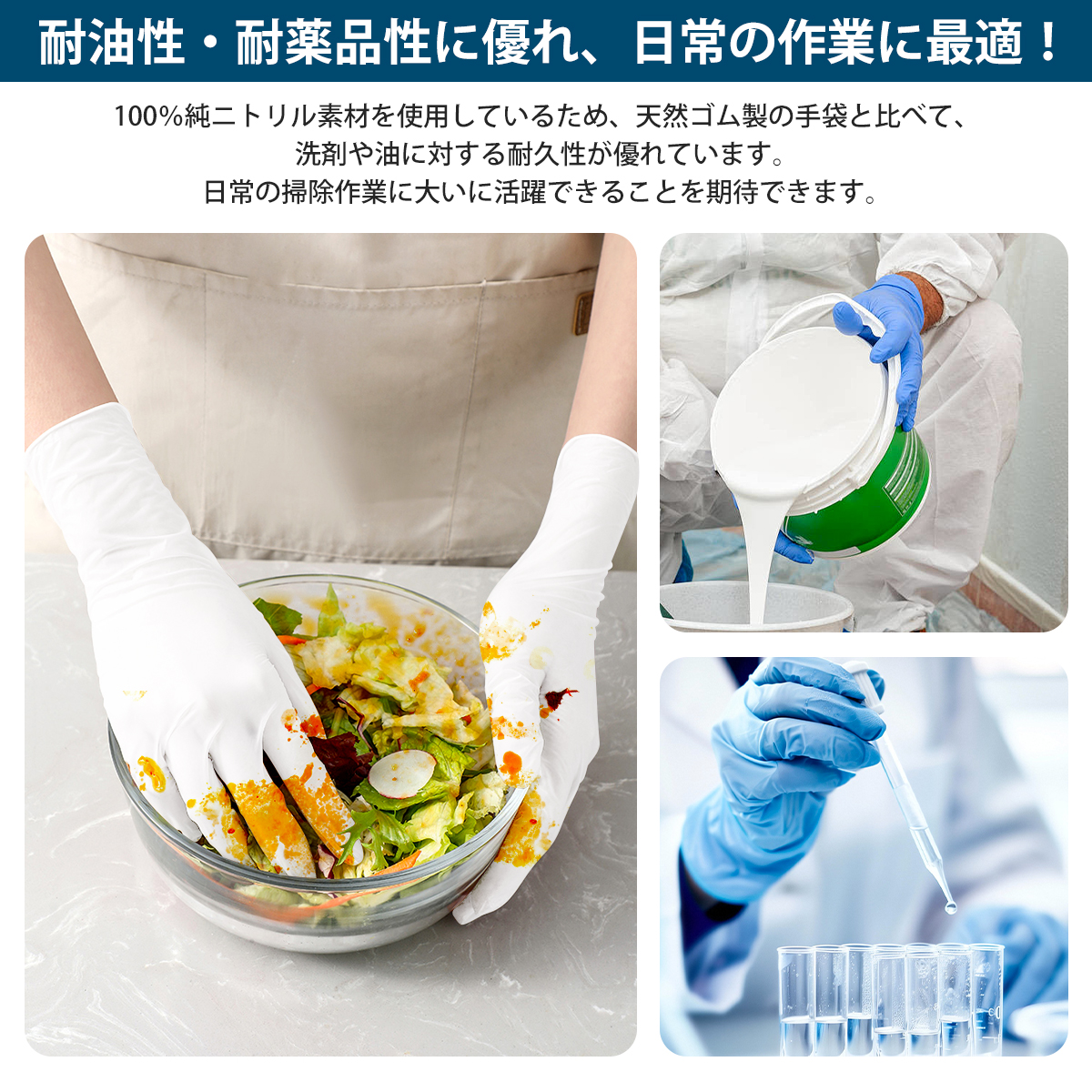 ● プラスチック手袋に比べ、耐油性、耐摩耗性、突き刺し強度に優れています。