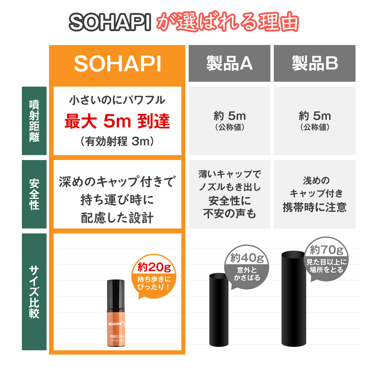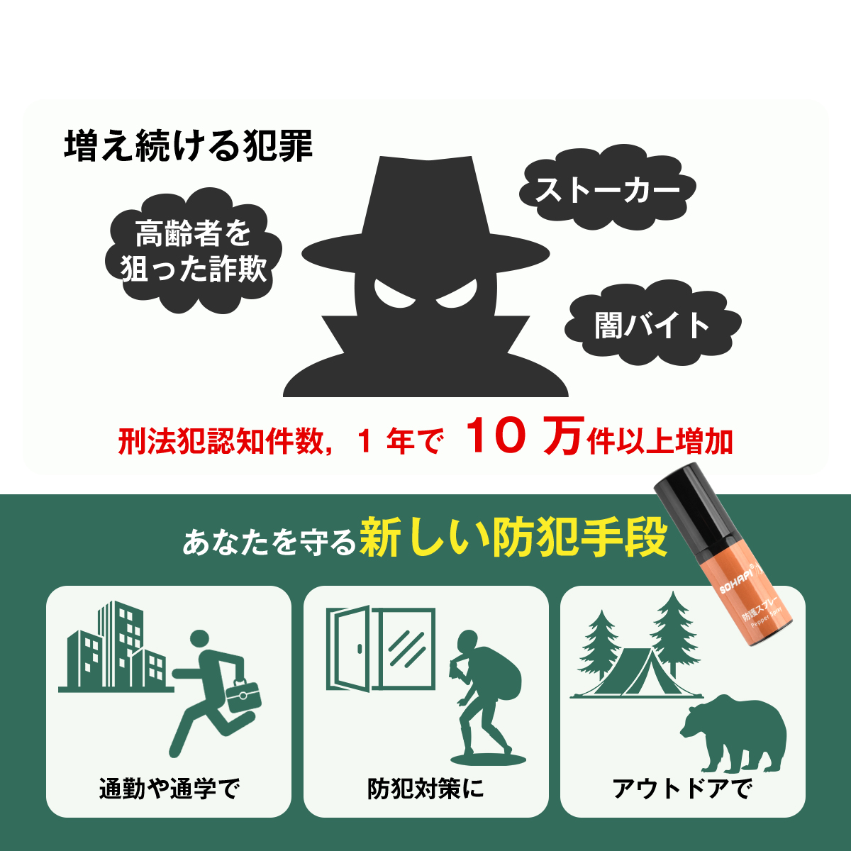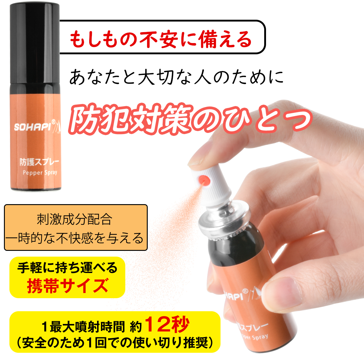 3. 安全設計|誤作動を防ぐ安全キャップを採用し、高純度カプサイシン(天然唐辛子由来)を主成分として使用。安全性に配慮しながらも、噴射されたエアロゾルを直接浴びなくても、近距離では咳き込みを誘発するほどの強力な防犯効果を発揮します。