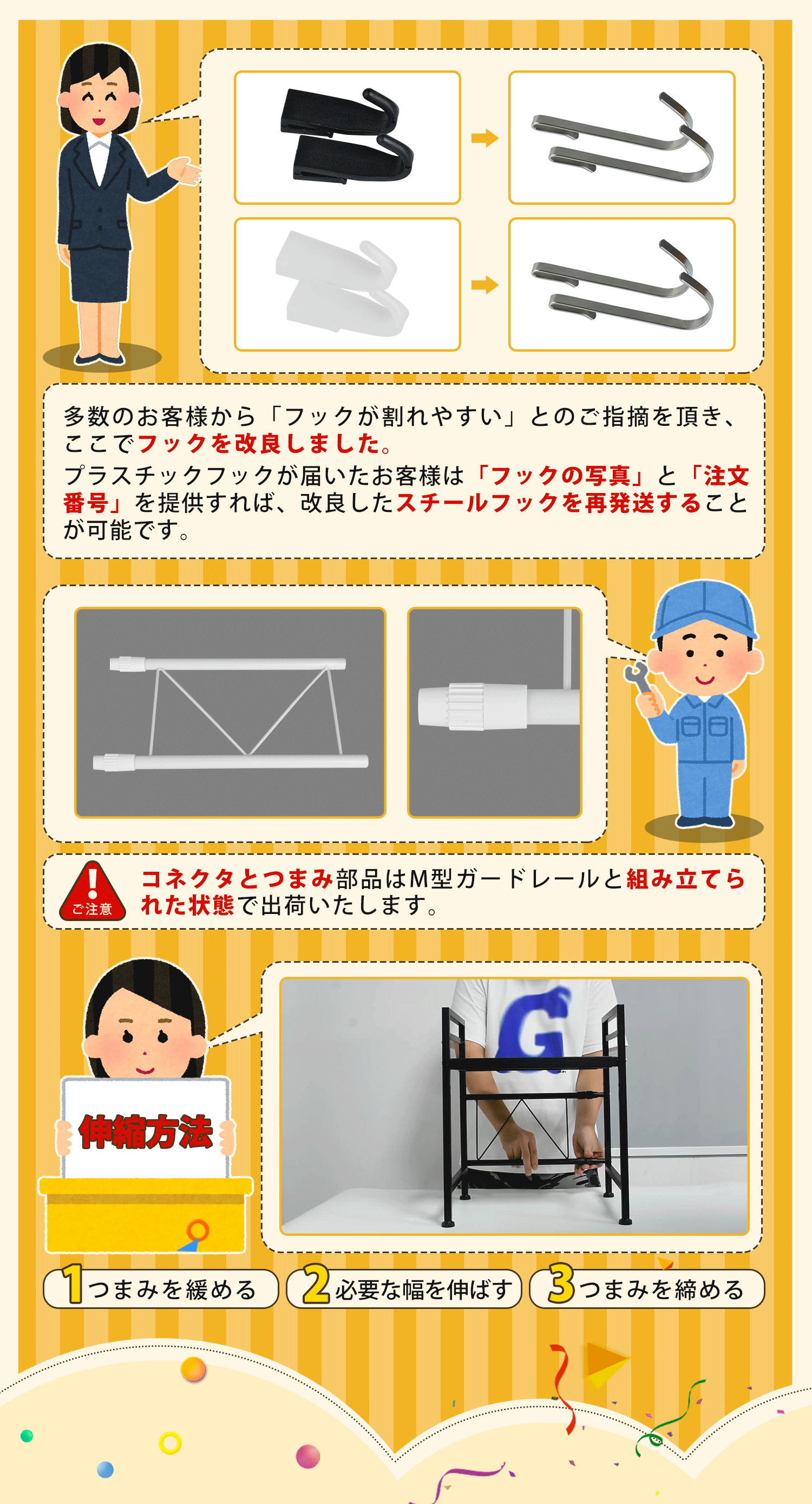 セット内容:支柱*2 伸縮天板*1 M型ガードレール*1 小型チューブ*2 コネクタ*2 つまみ*2 フットパッド*4 フック*4 ネジ*8 六角レンチ*1