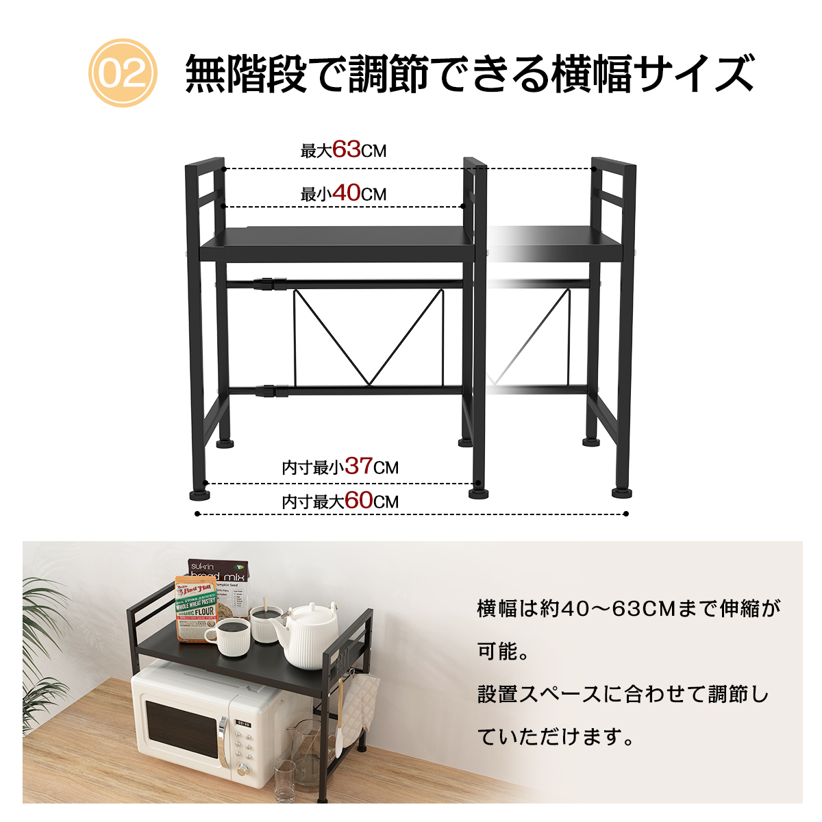 レンジ上ラック 伸縮式 収納 サイズ調整可能 幅40−63cm レンジ台 棚 キッチンラック 省スペース 家電 冷蔵庫上 調味料 敬老
