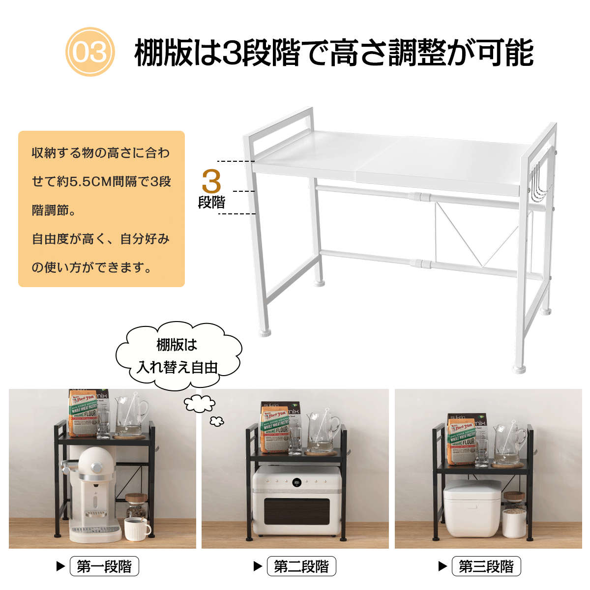 ポイント3 【棚版は3段階で高さ調整が可能】