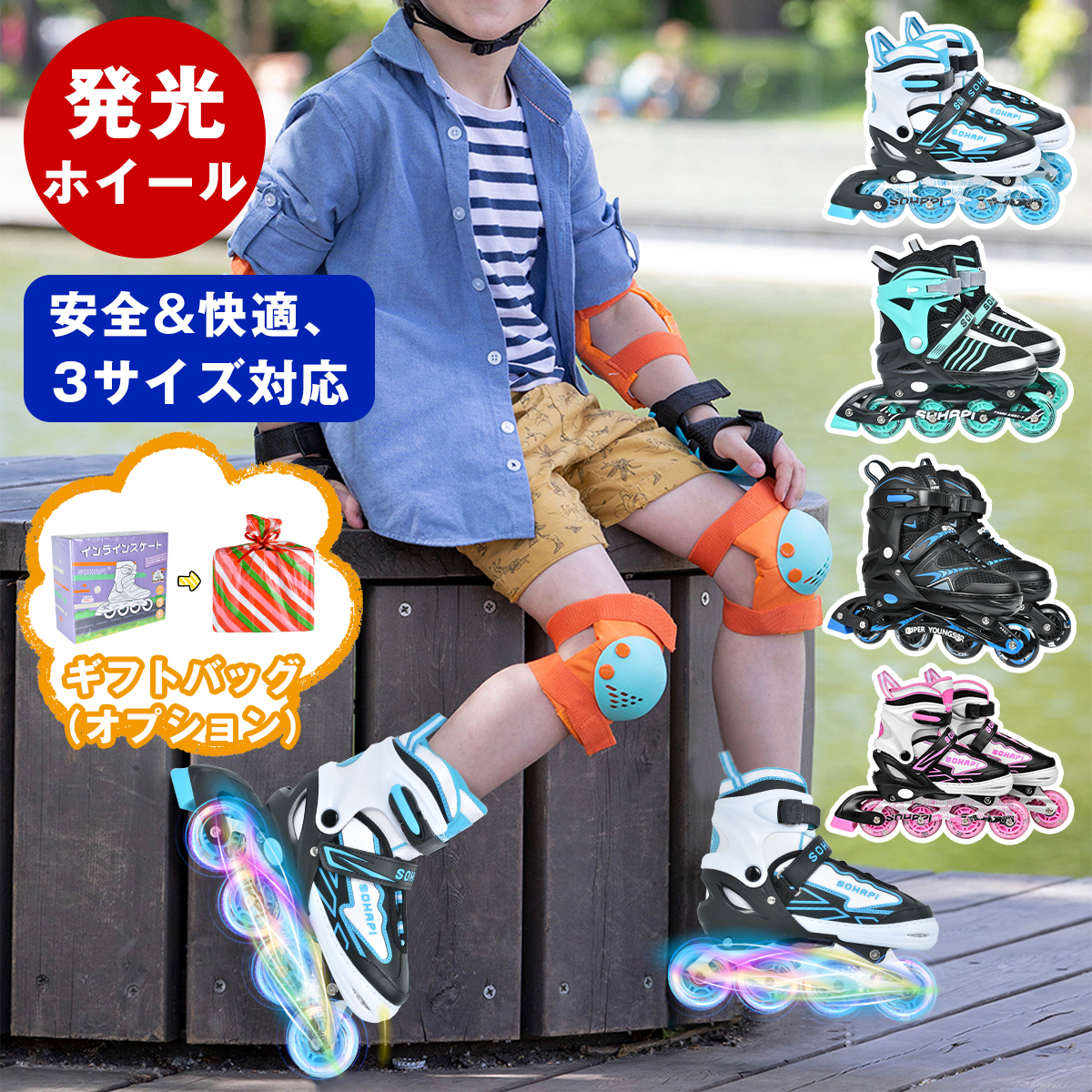 【一位】インラインスケート 子供 ジュニア キッズ 大人 光る タイヤ ローラーブレード ローラースケート バッグ付き ピンク 初心者 静音 サイズ調整 誕生日