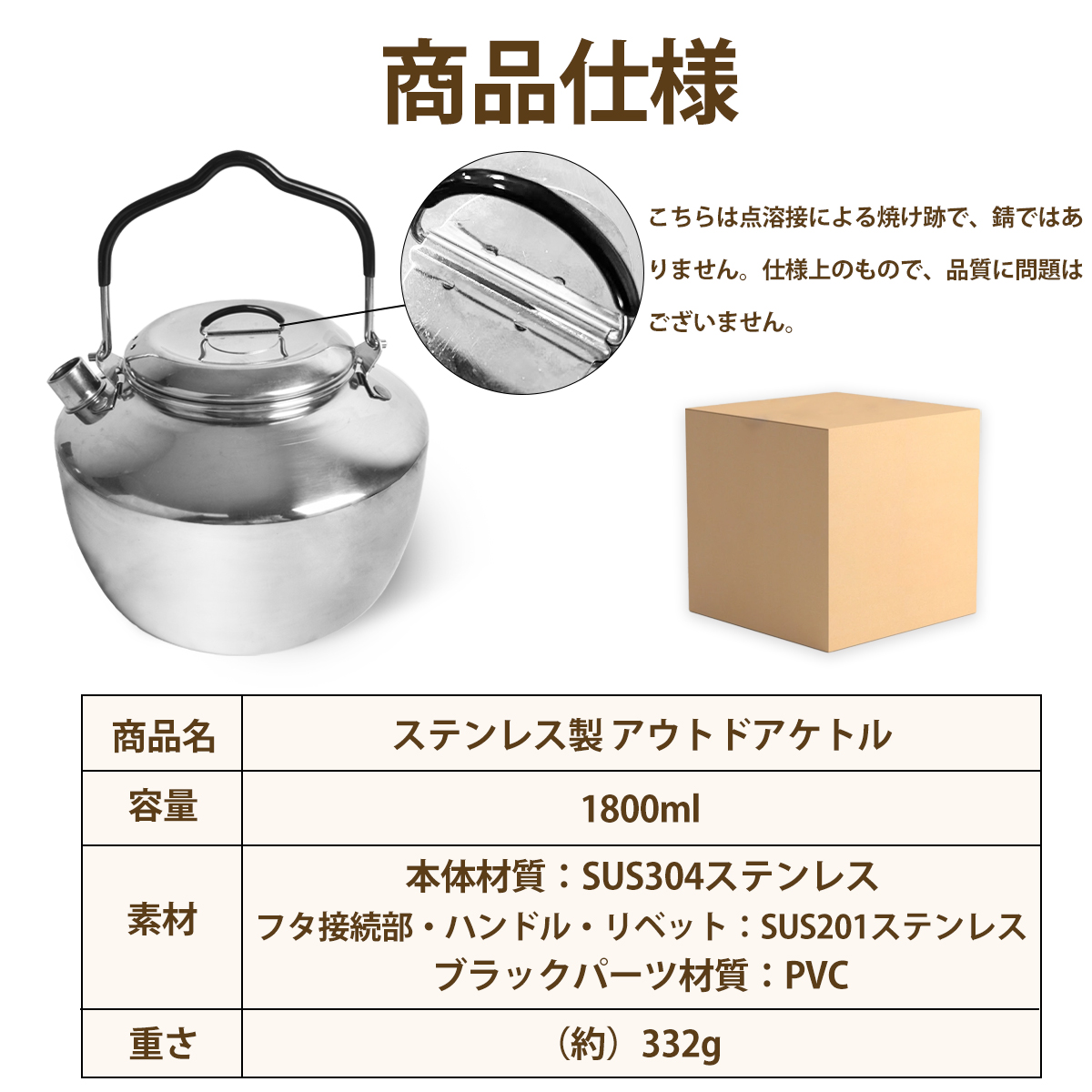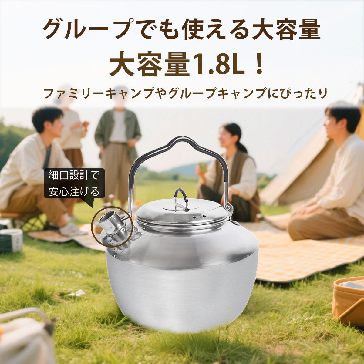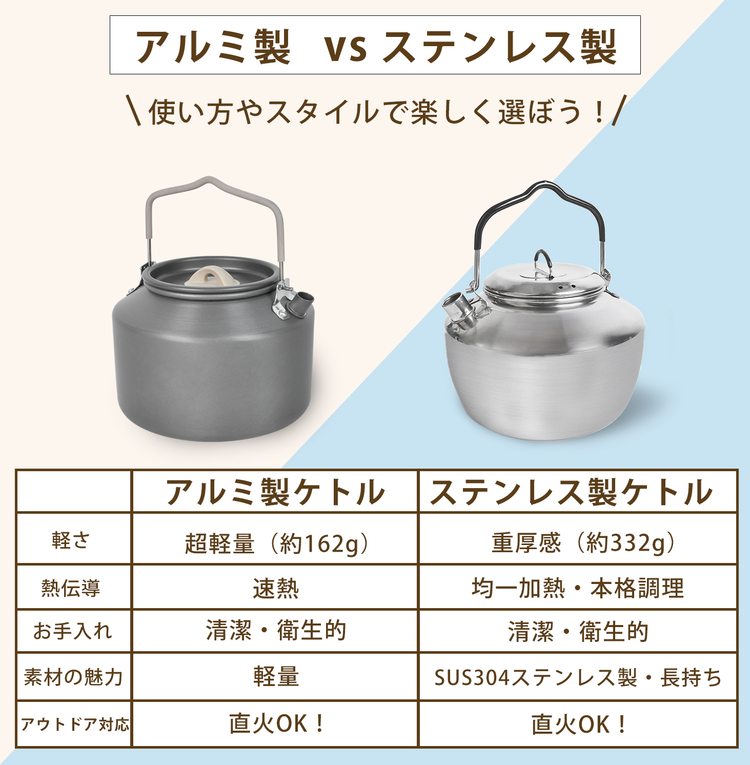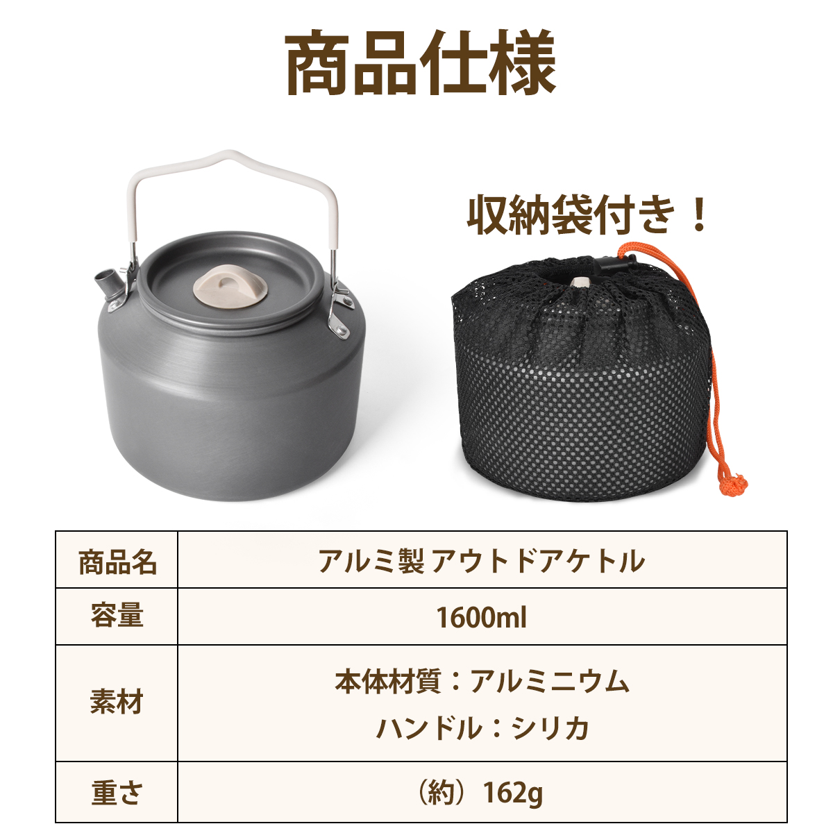キャンプケトル アウトドアケトル 直火対応 ステンレス304/アルミ 1.8L/1.6L 専用収納袋付き ポータブル やかん 軽量 錆びにくい 丈夫