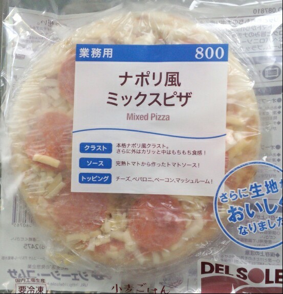 原材料名:ピザクラスト(小麦粉、植物性ショートニング、砂糖、植物油脂、イースト、食塩)、ナチュラルチーズ、トマトソース、ソーセージ、マッシュルーム、ベーコン、ピーマン、黒こしょう、酸味料、カゼインNa、リン酸(Na)、増粘剤(キサンタンガム)、着色料(パプリカ色素、コチニール)、調味料(アミノ酸)、酸化防止剤(ビタミンC)、pH調整剤、発色剤(亜硝酸Na)、香辛料抽出物、(原材料の一部に豚肉、大豆を含む)