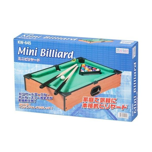 【ここがポイント!】 家庭で本格的ビリヤード!ミニサイズで場所をとらず、家庭で気軽に出来るミニビリヤード台セットです。 ビリヤードテーブル、ボール、キュー等全てが本格的仕様!本物さながらの感覚でプレイできます。お部屋のインテリアとしても、とってもオシャレです。 【商品詳細】 サイズ 約W510×L310×H100(mm) 重量 約3kg 材質 MDF合板・天然木・ABS・ポリプロピレン セット内容 ビリヤード台×1キュー×2球×16ラック×1チョーク×1