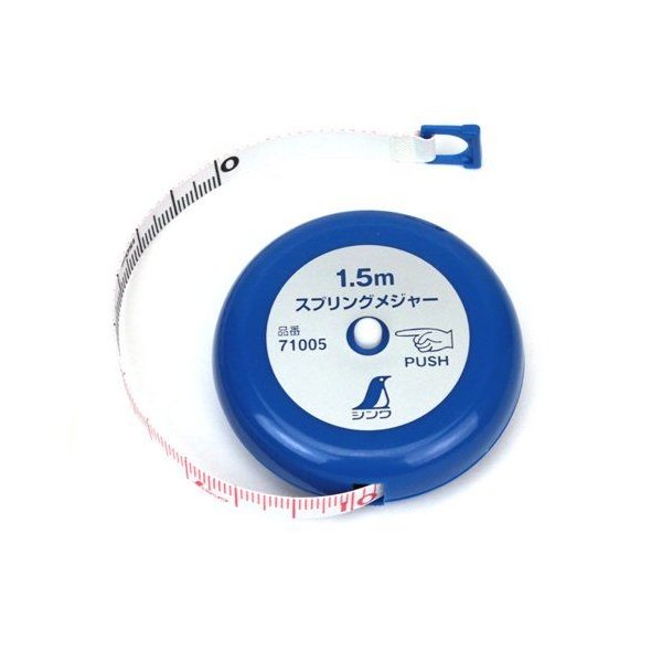 特長●自動引き込みボタンを押すだけで、メジャーが自動的に引き込まれます。●洋裁や曲面の測定に。仕様●テープ巾 8mm●テープ長 1.5m●製品質量 25g●本体サイズ φ54×20mm●長さの許容差 ±1.4mm●材質 テープ:ガラス繊維入塩ビ被覆 本体・テープ端部:ABS樹脂